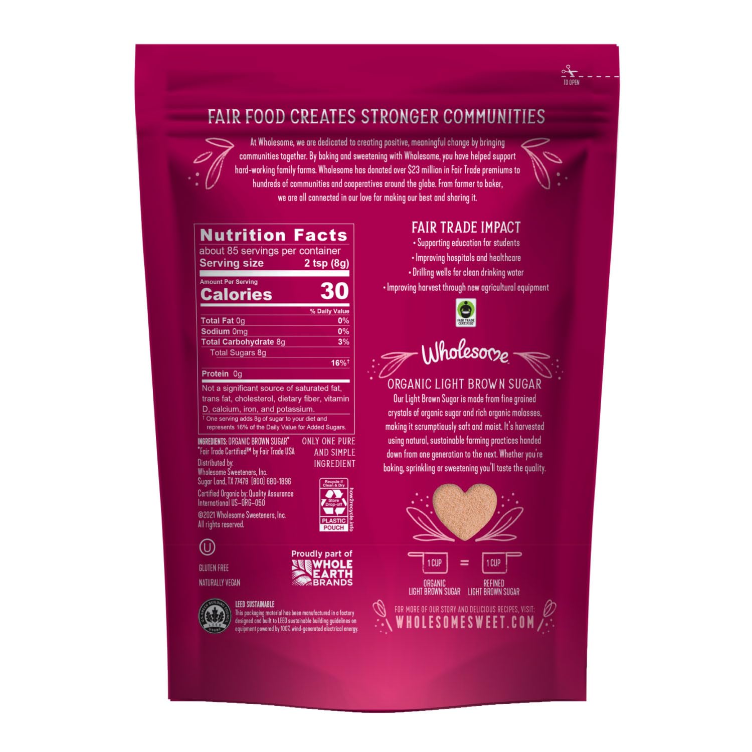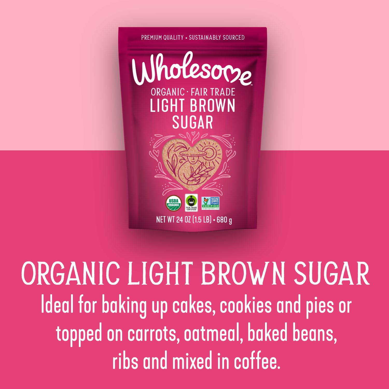 Wholesome Sweeteners 24-Ounce Organic Light Brown Sugar, Fair Trade, Non GMO, Gluten Free & Vegan, Sugar for Baking and Glazing, 1 Pack