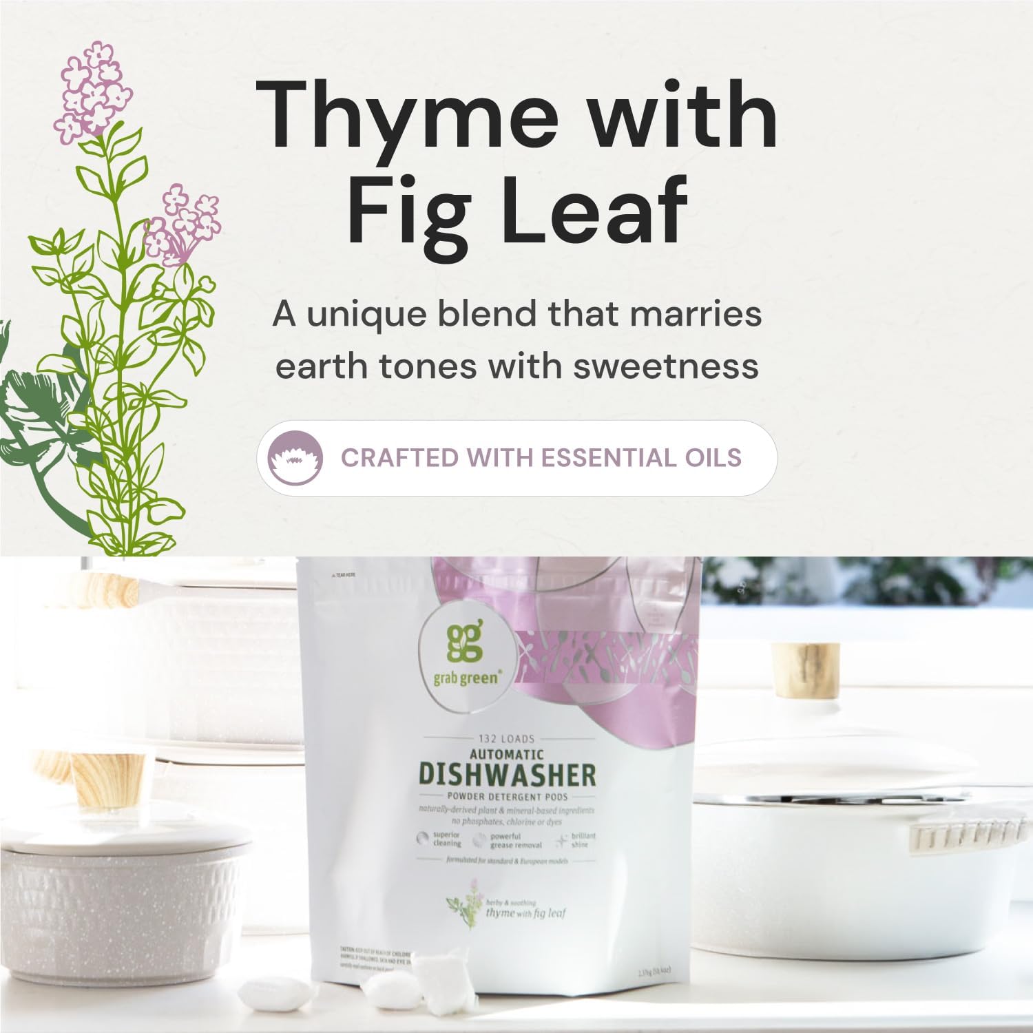 - Thyme with Fig Leaf: Our convenient, pre-measured pods provide a soothing, soft and delicate natural fragrance. Just drop one in your dishwasher and easily tackle your toughest loads