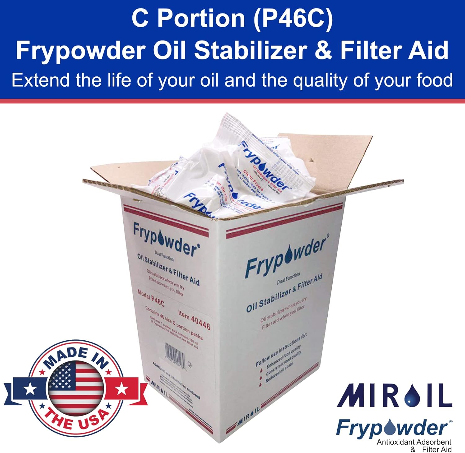 - EXTEND FRYING OIL LIFE & ENHANCE FILTRATION EFFICIENCY - This carton includes 46 individual C-size (160ml) portion packs of MirOil Fry Powder, designed to optimize deep fryer oil filtration and extend the lifespan of frying oil. This oil stabilizer helps maintain oil freshness, improves food quality, and reduces oil consumption, making it ideal for commercial kitchens, restaurants, food trucks, and catering businesses. Use it with deep fryers, oil fryers, and commercial frying systems to minimize waste, lower costs.