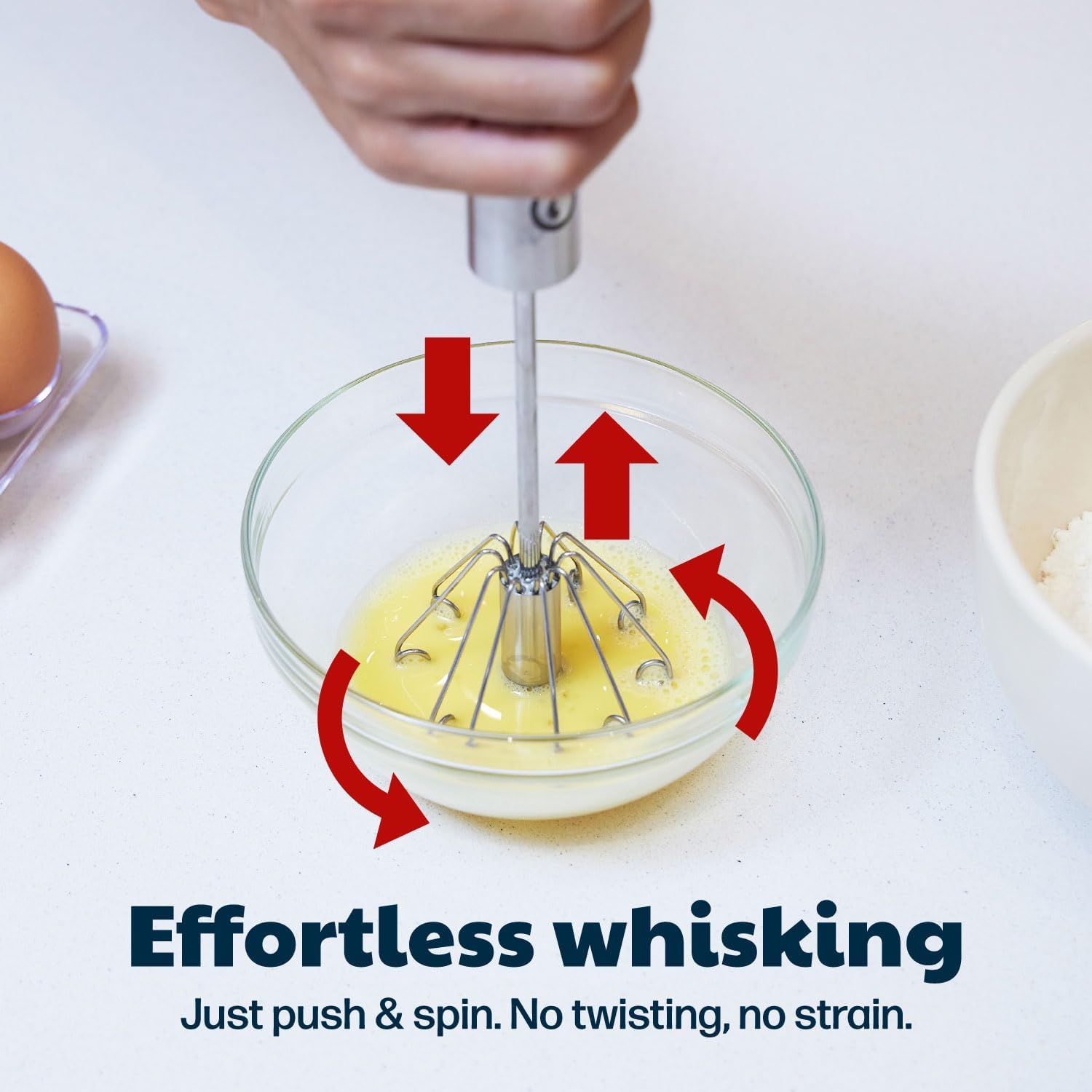 - QUICK AND EASY: Our stainless steel semi-automatic whisk is super fast and ultra-easy to use. To rotate the head on our easy whisk, simply push down and release up. Both of these actions will rotate our semi automatic whisk clockwise and then counterclockwise.
