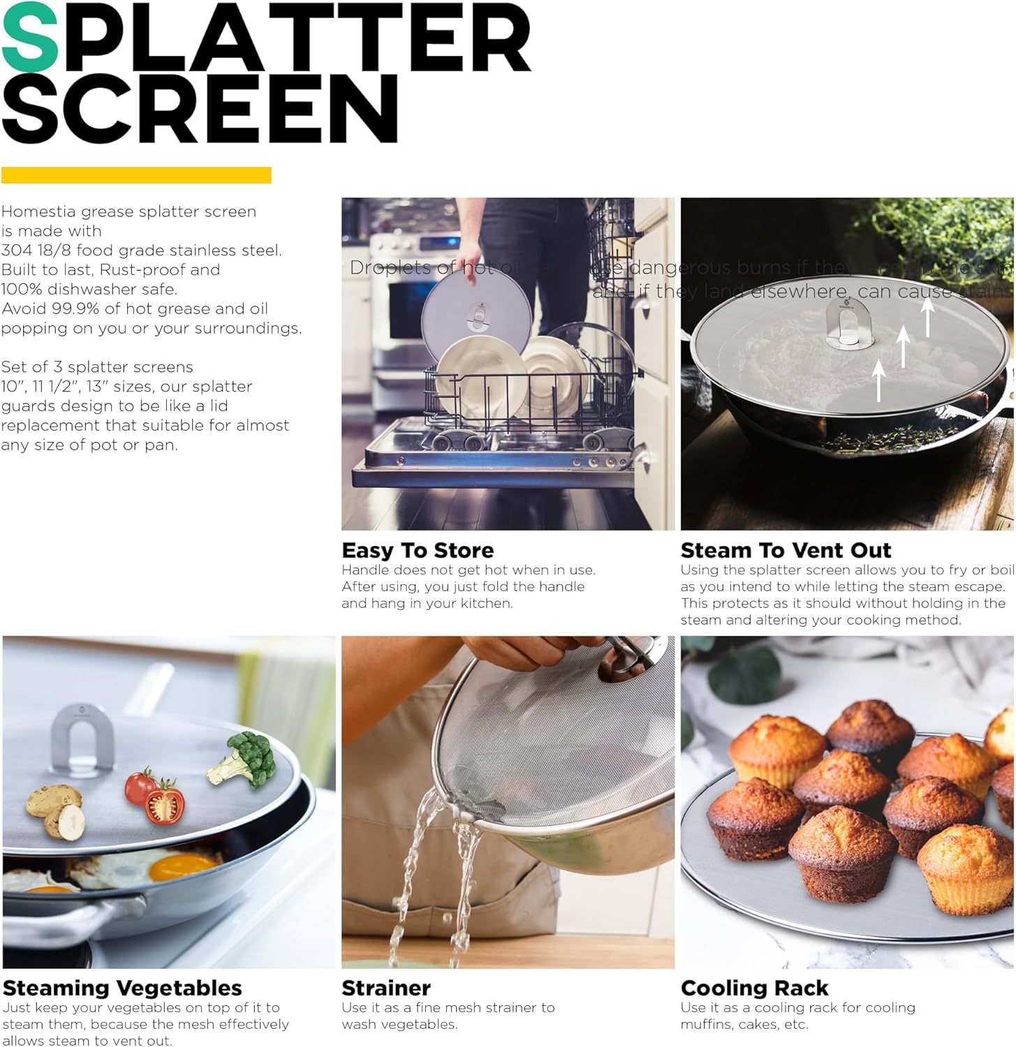 Homestia Kitchen Splatter Screen for Cooking - 10'' 11.5'' 13'' Stainless Steel Grease Splatter Guard for Frying Pan, Ultra Fine Mesh Lids with Fold Flat Knob Set for Prevent Oil Splatter (3 Pack)