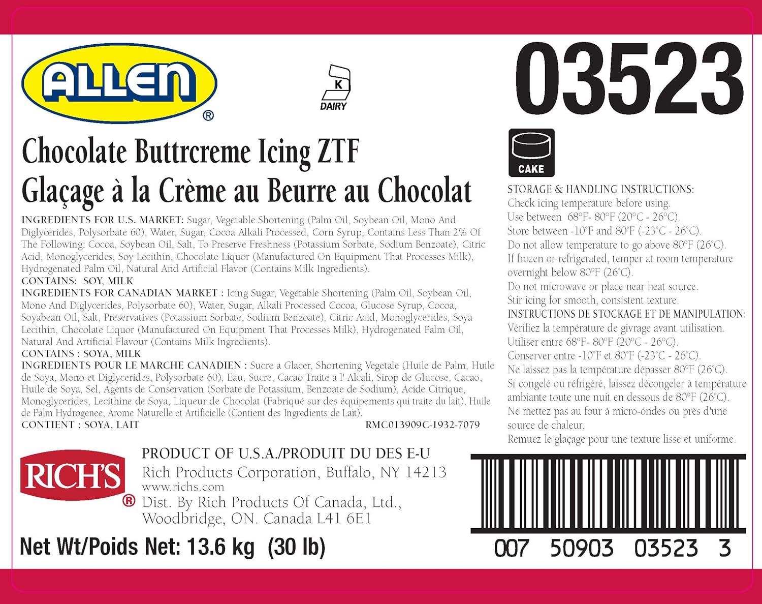 Rich's JW Allen Pre-Whipped Chocolate Buttercreme Icing ZTF, 30 lb