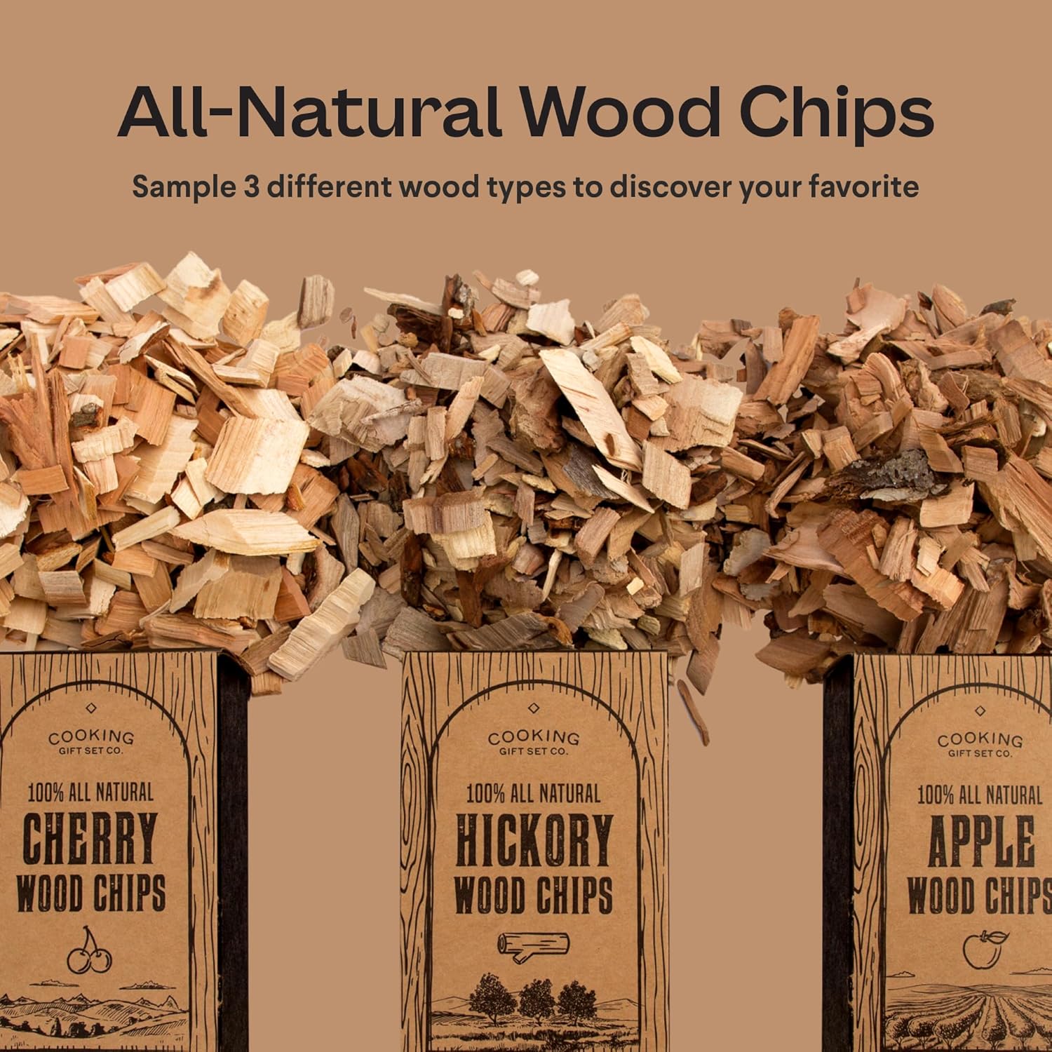 - Three Premium Wood Flavors - Includes Apple, Cherry & Hickory wood chips for sweet, mild or bold smoke. Mix and match flavors to create your own signature style.
