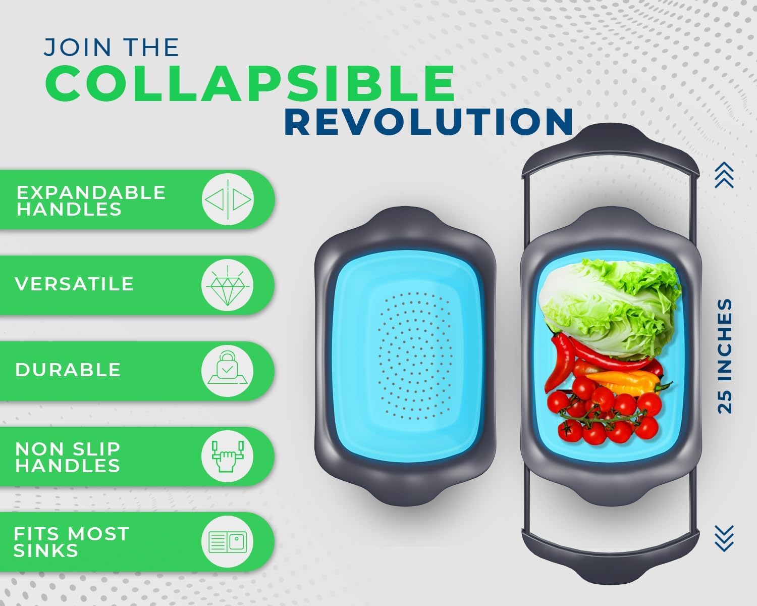 XL Large Kitchen Strainer by Comfify - Collapsible Silicone Over - The-Sink Colander with Extendable Handles - Use with Pasta, Fruit, Berries & Veggie - 6 Quart - Blue