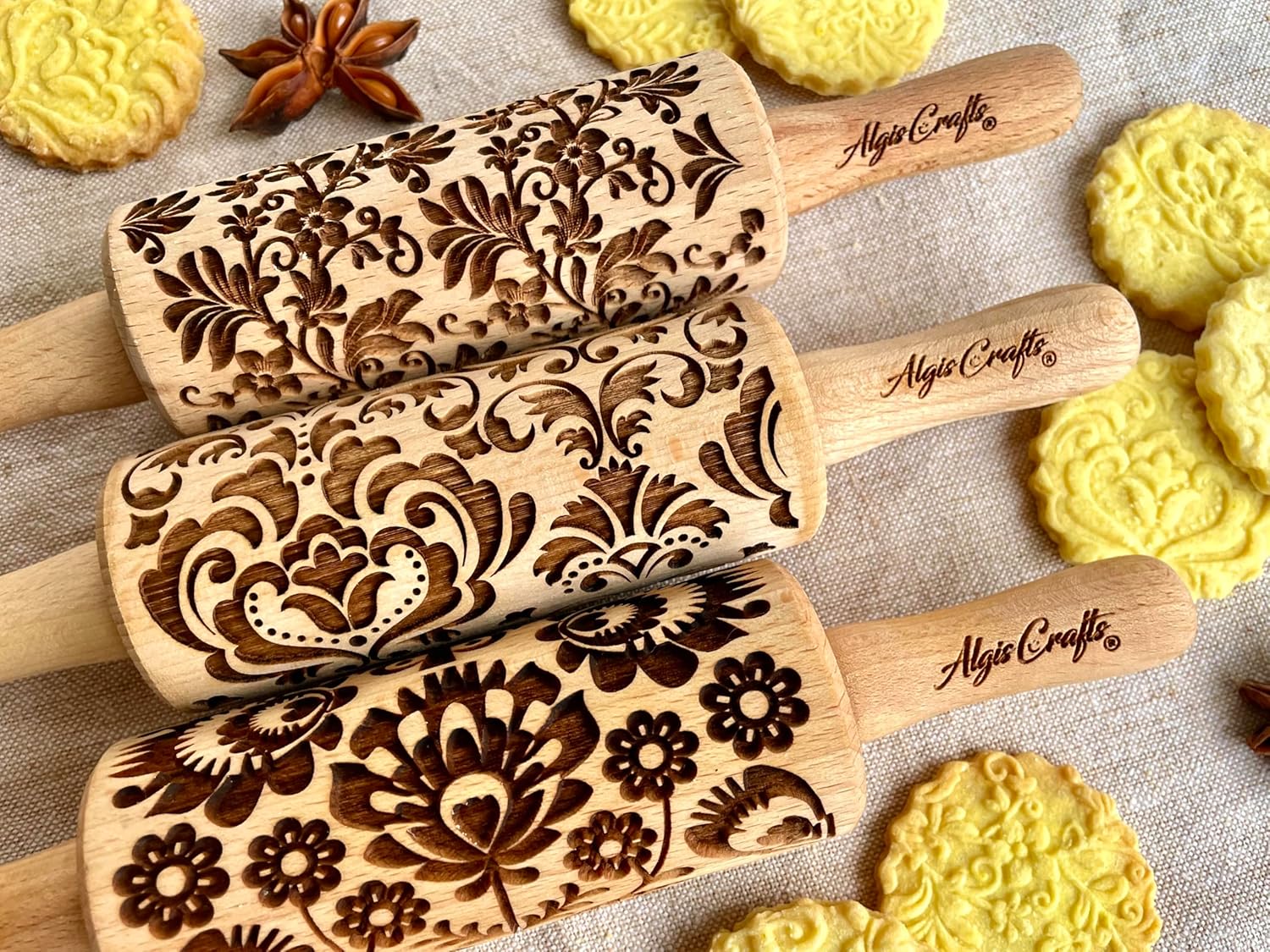 FLOWERS 3 Kid Rolling Pin Set with Damask, Folk and Floral Wreath Patterns. Wooden Laser Cut Mini Rolling Pins for Cookies, Play Dough, Salt Dough or Clay by Algis Crafts