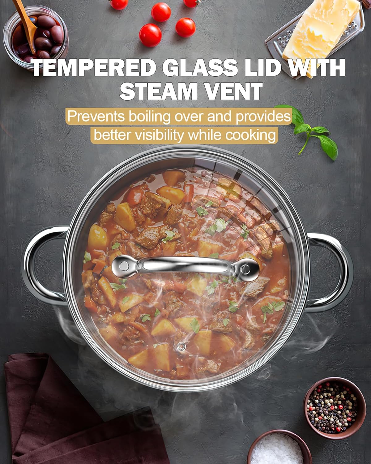 - Glass Lids and Comfortable Handles: The tempered glass lids a steam vent to view food while cooking; Riveted stainless steel handles are durable, comfortable, and wide/deep for a secure grip