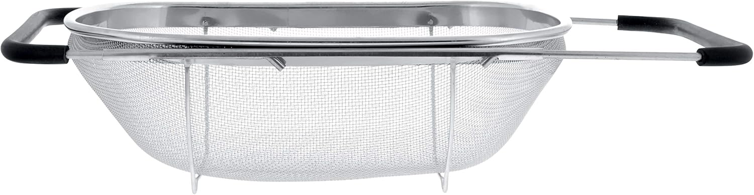- Professional Grade Mesh Colander Basket: Premium quality high performance over the sink oval stainless steel colander with a fine mesh net strainer basket and expandable rubber grip handles. The colander features sturdy handles that extend from 14" out to 21", which allows it be be used over or in most sinks. It has a mirror finished wide rimmed frame with resting feet on the bottom. The rust-proof firm fine mesh keeps the baskets netting in shape while in use