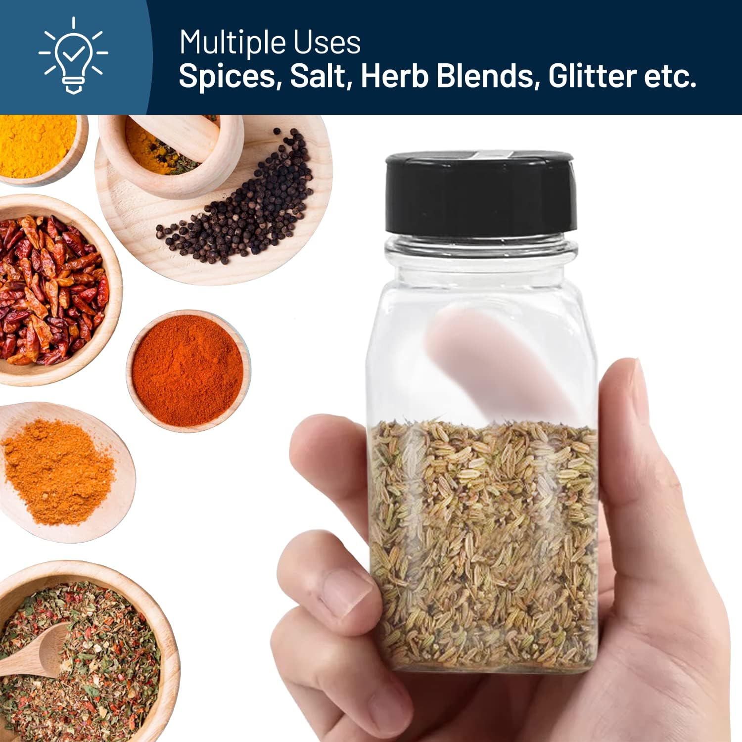 - Multi-Purpose: Our clear plastic jars are perfect for storing dried spices, salt, peppers, seasonings, herb blends, powder, glitter, bath salts, crafts, etc.