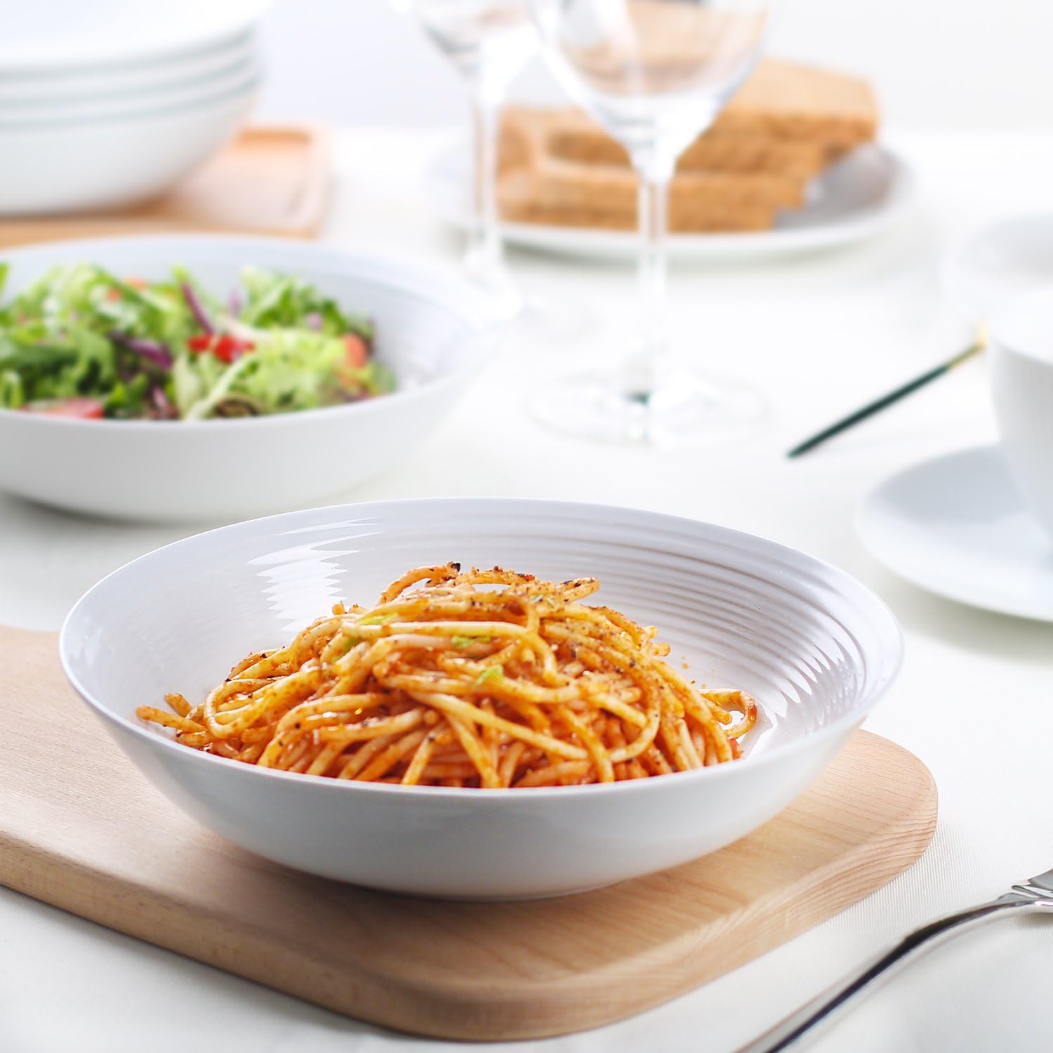 - Versatile Wide Shallow Bowls: The wide shallow design offers the most flexibility. This pasta bowl set is essential to your kitchen, you can serve hearty portions of pasta, salad, soup, stew, vegetables, cereal, curry over rice, stir-fried dishes, seafood, noodles, dessert, beans, ice cream, sauce or leftover, etc. Suitable for lunch, dinner, party, wedding, festival, and restaurant