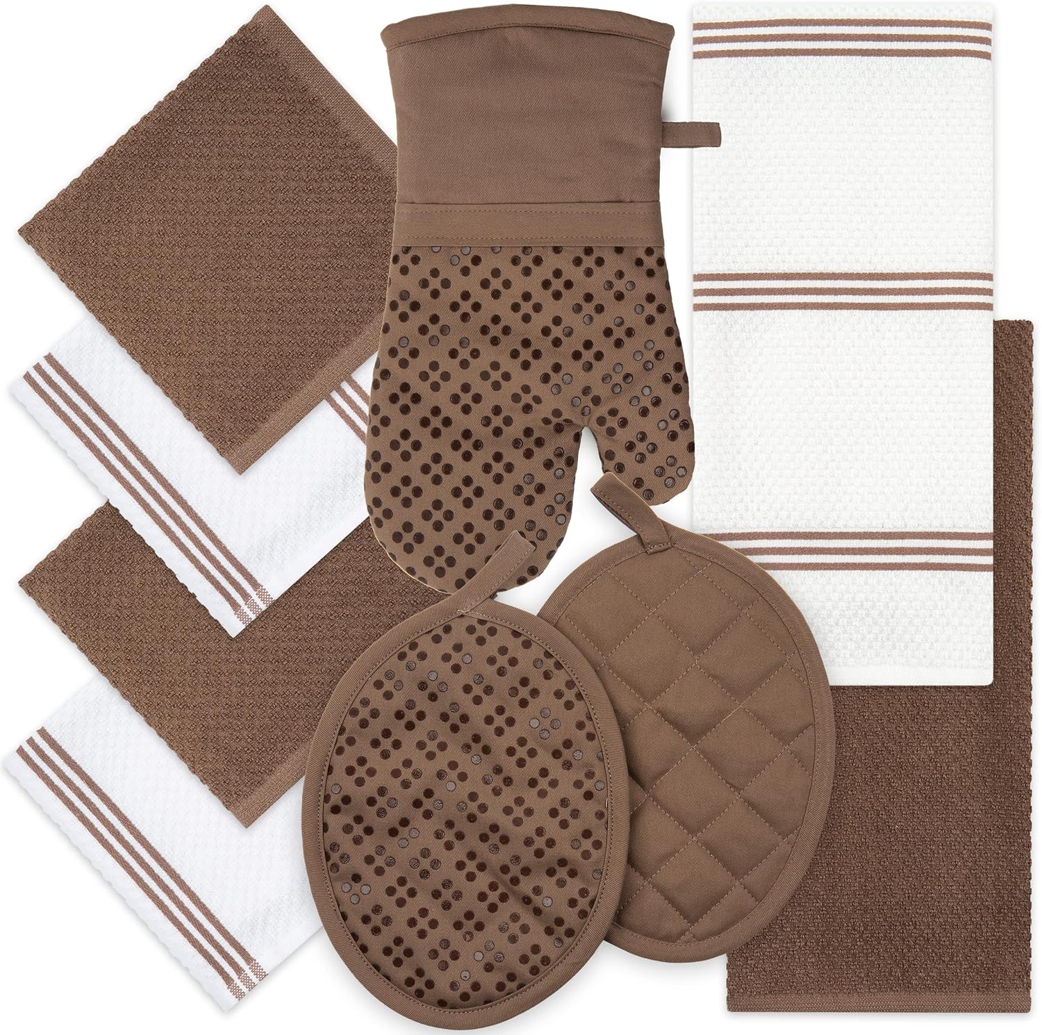 Sticky Toffee 9-Piece Kitchen Set – Brown 100% Cotton Terry Dish Towels, Dishcloths, Oven Mitts, and Pot Holders with Non-Slip Silicone Grip, Oeko-Tex Cotton