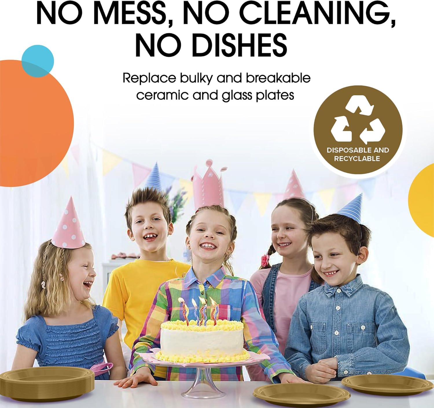- Includes: Each pack comes with 100 gold 10 inch dinner plates. These plates may be used as dinner plates or cake plate and also make a great use as picnic supplies. Having these will complete your plastic dinnerware collection.