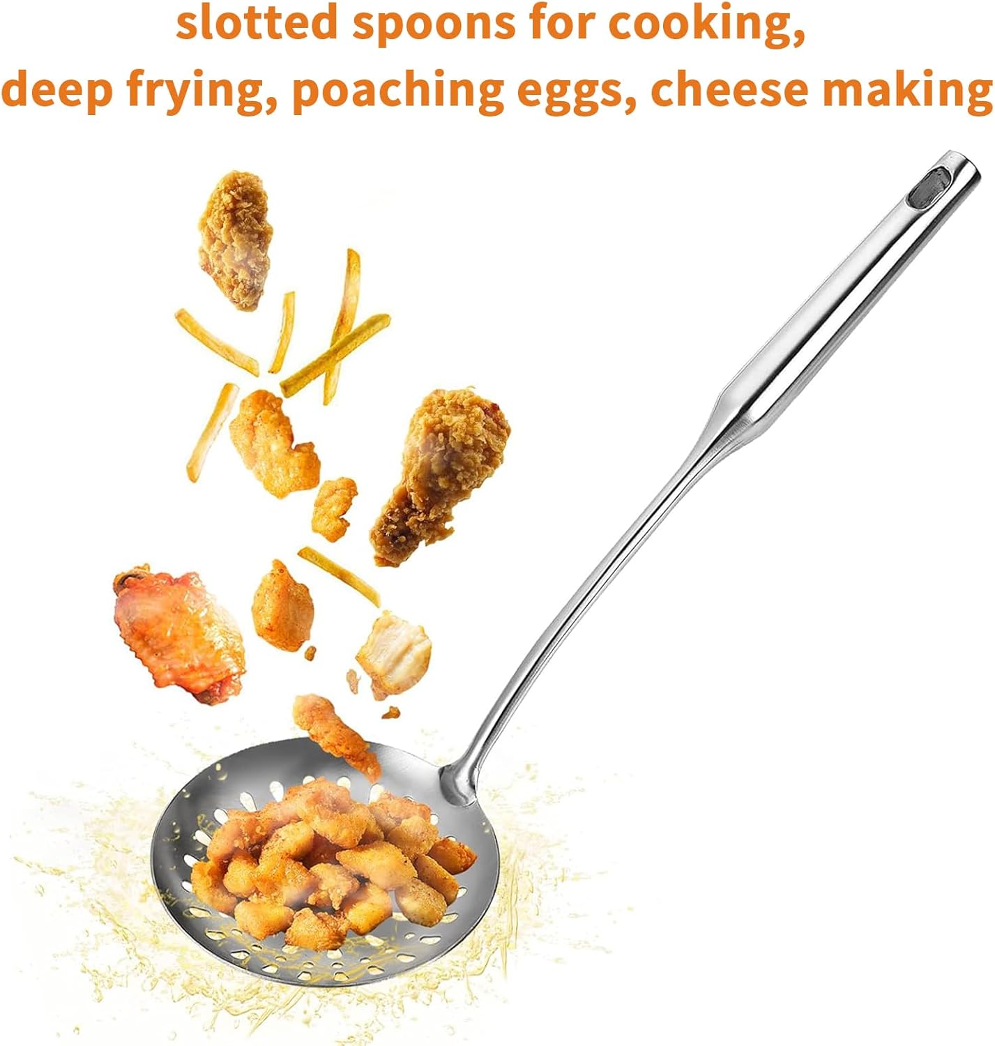 - High Quality Material - Stainless steel ladle made of food grade 304 Stainless Steel. Stainless steel strainer safe, rustproof, durable and will last long. skimmer spoon is excellent kitchen helper, slotted spoons for cooking, colander for kitchen, fryer scoop, perfect holidays, birthday gifts for family, friends or kitchen lovers