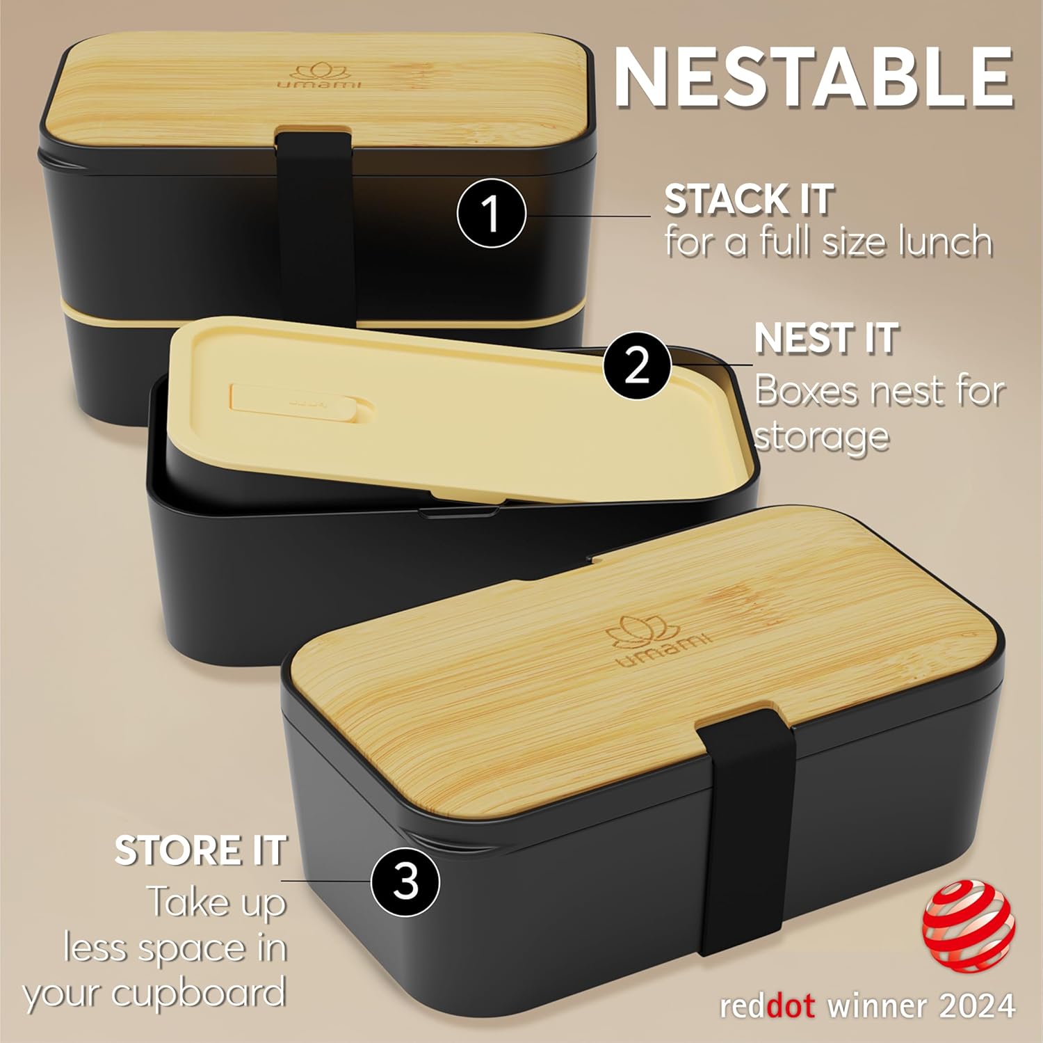 - Everything you need. Nothing you don’t. This all-in-one bento lunch box includes a full cutlery set, 2 sauce jars, and a clever nestable design. No clutter. No forgotten forks. Just grab and go