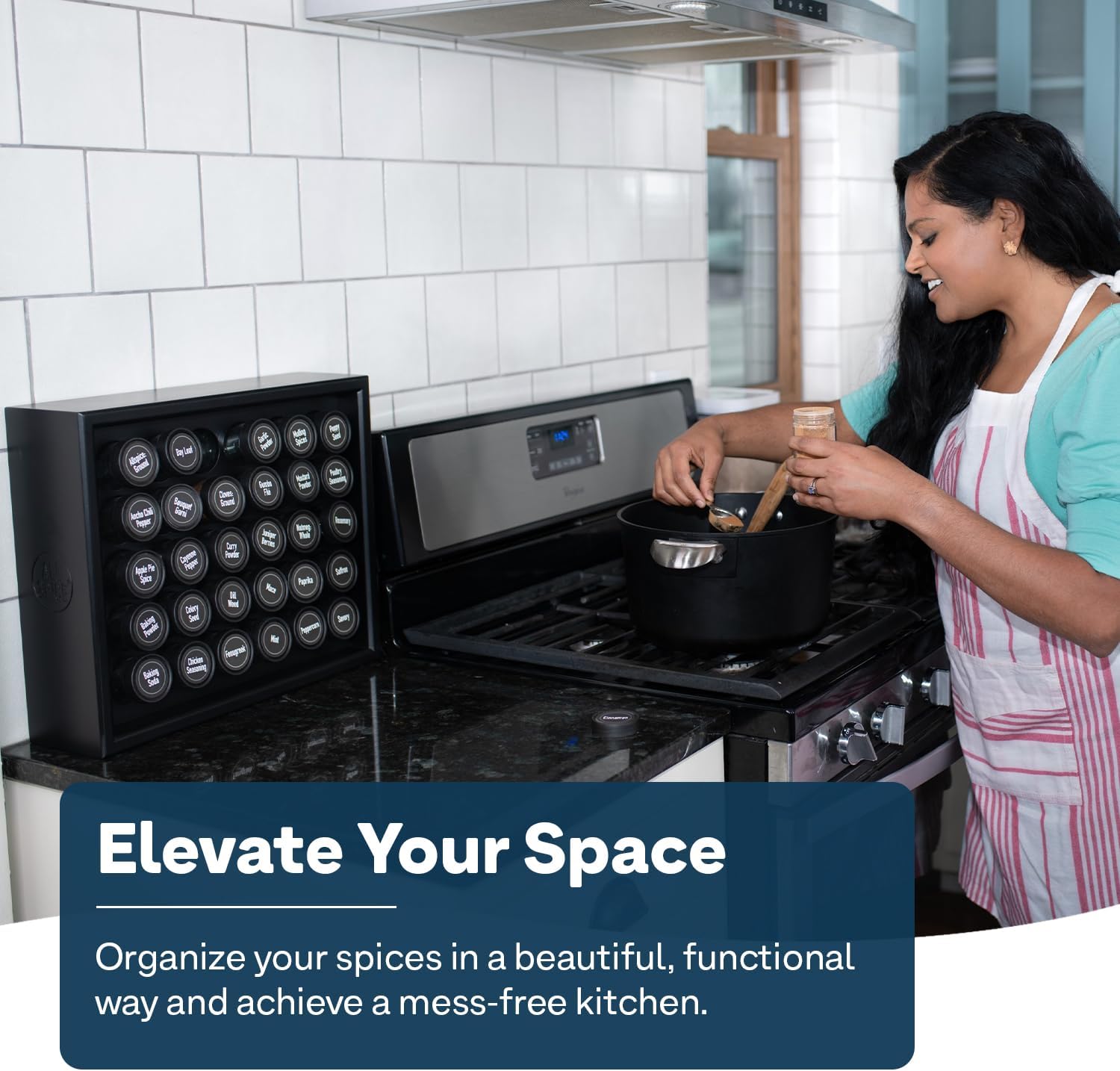 - Solid Bamboo Wood - Crafted with a durable bamboo frame and painted with a sleek matte black finish, the All Spice organizer infuses style to any kitchen or pantry décor while eliminating cluttered countertops, cabinets and seasoning containers