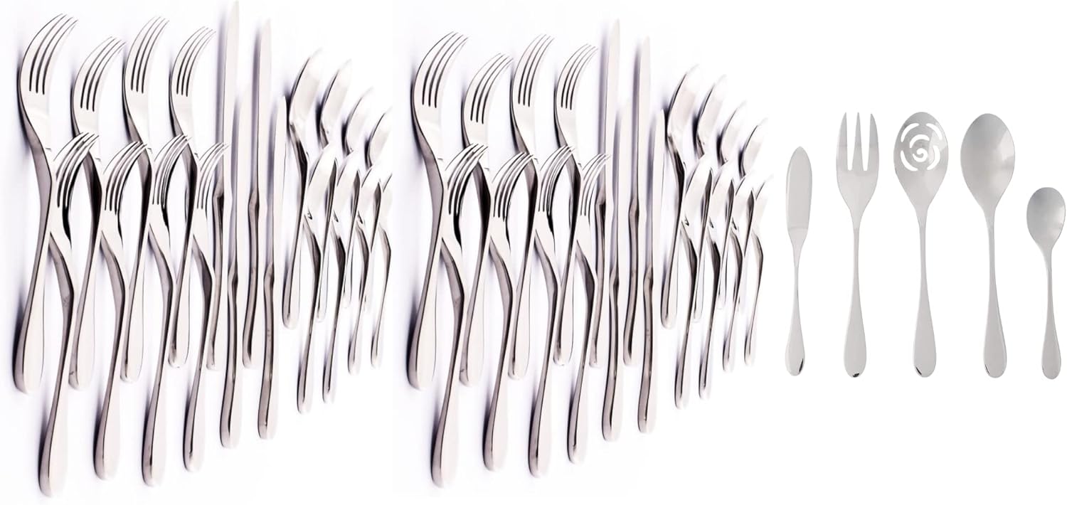 - COMPLETE SET FOR ANY OCCASION - This set includes 8 dinner knives, 8 dinner forks, 8 salad/dessert forks, 8 tablespoons, 8 teaspoons, as well as a serving spoon, slotted spoon, meat fork, butter knife and sugar spoon. It is perfect for formal dinners or casual meals with family and friends.Forks feature beveled tines for additional cutting power