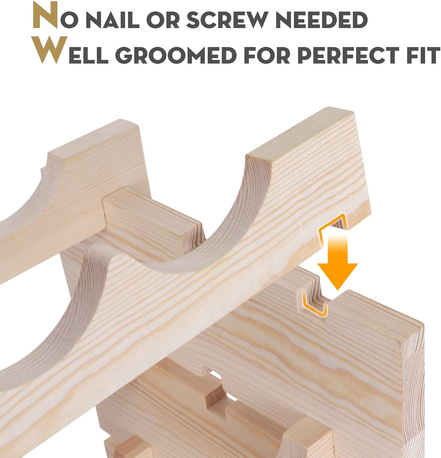 - ăClassic DesignăClassic design to accent any home, kitchen, dining room, or wine cellar. Versatile modular stacking style,wave shaped shelves,arc design prevent wine bottles scattered around dowel. Unfinished wood gives option to stain, paint, varnish or leave as it is.Each piece of wood has notches and slots so they can fit together well, make the wine rack more sturdy.