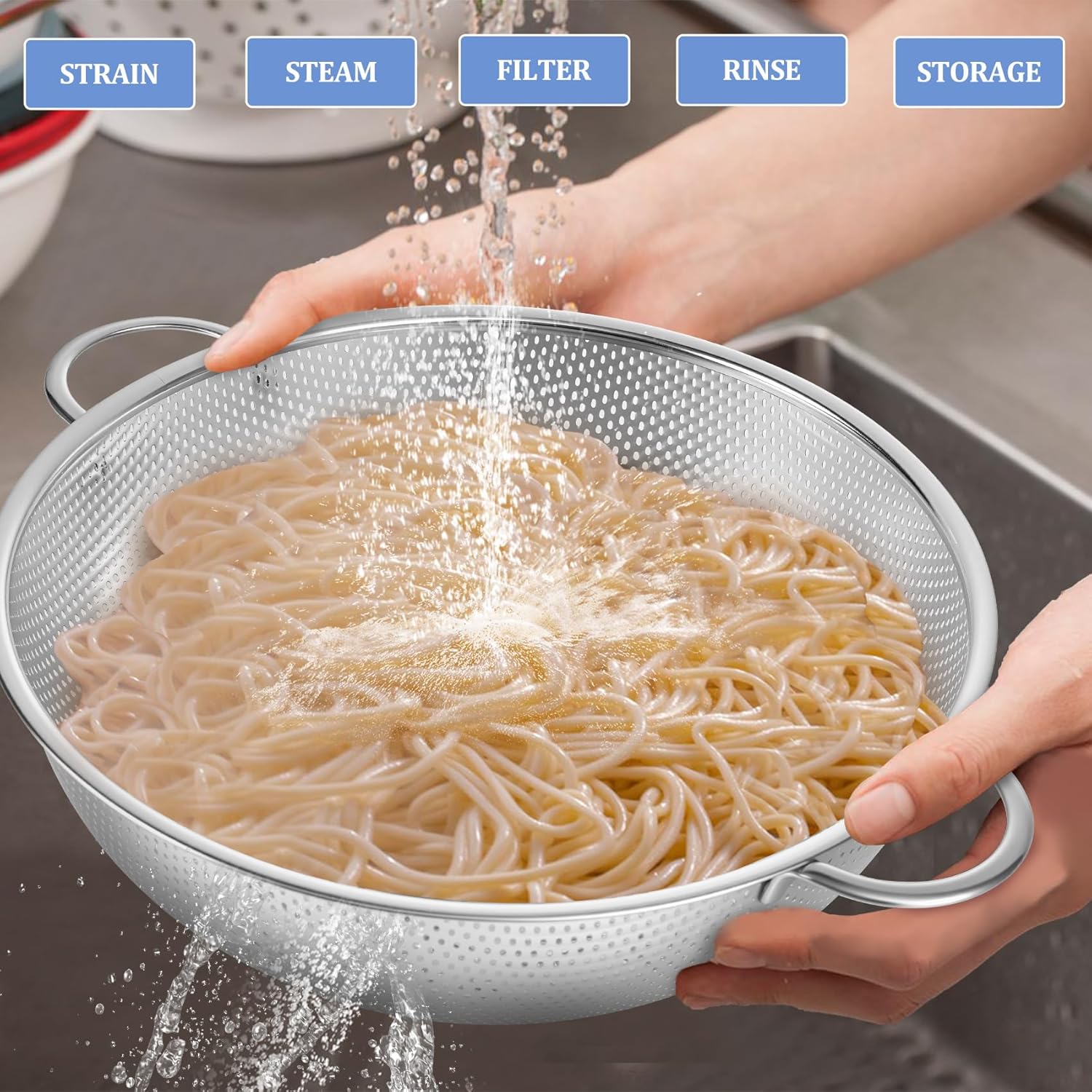 - EASY CLEAN - Smooth mirror finish easily pouring the food, Effortless clean by hand washing, Or just run the metal colander through the dishwasher to save your labor