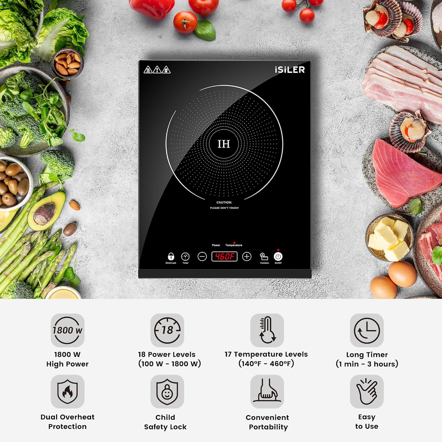 - 18 POWER LEVELS: Quickly choose your desired power from 100W to 1800W in 100W increments(long press for 300W); 1800W power to meet your various cooking needs; simmer, deep fry, boil, sauté, sear, steam, slow cook and grill with ease.