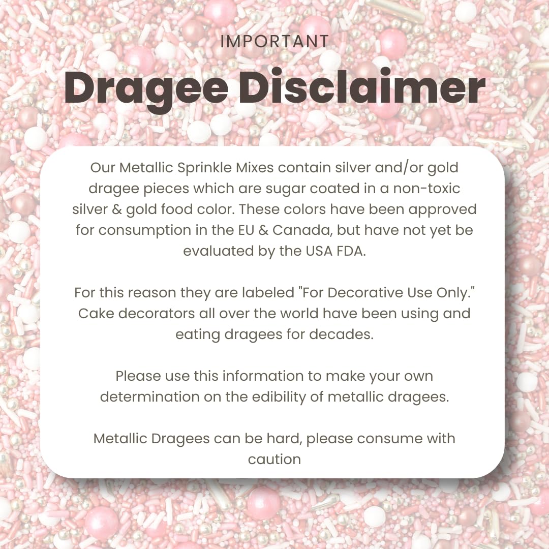 - Metallic Dragees Disclaimer: Silver and gold dragees are commonly used by cake decorators worldwide. While approved for consumption in some regions, they are traditionally labeled as “For Decorative Use Only” in the U.S. Please use discretion when adding them to your creations