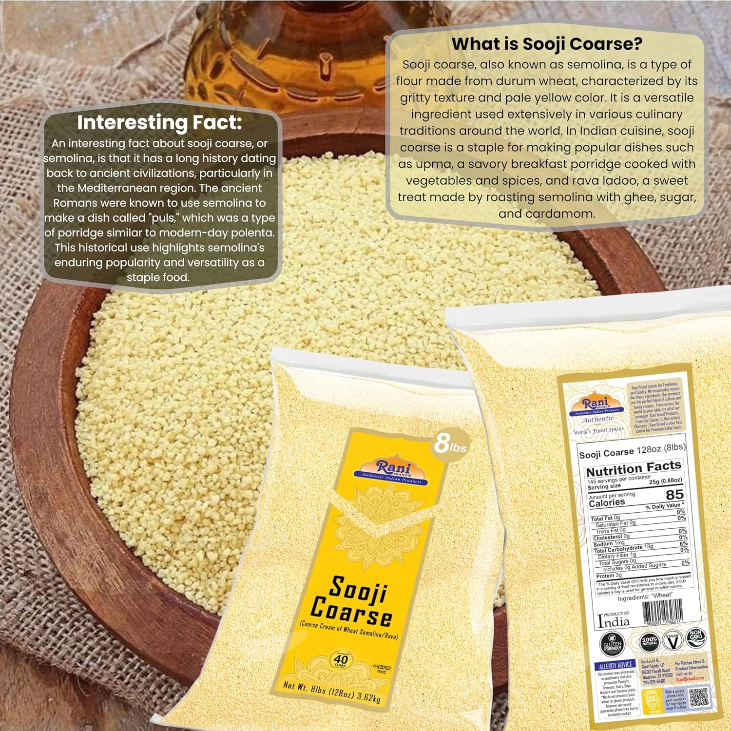 Rani Sooji Coarse (Farina, Suji, Rava, Rawa, Wheat Semolina) Flour 128oz (8lbs) 3.63kg Bulk ~ All Natural | Vegan | NON-GMO | Kosher | Indian Origin