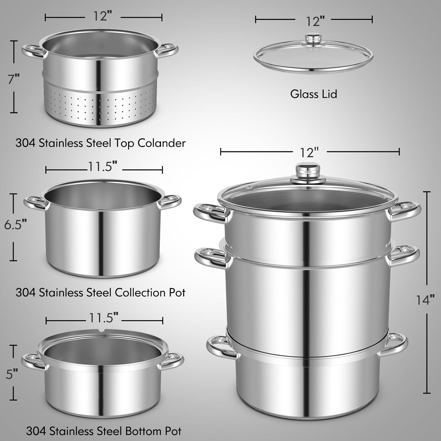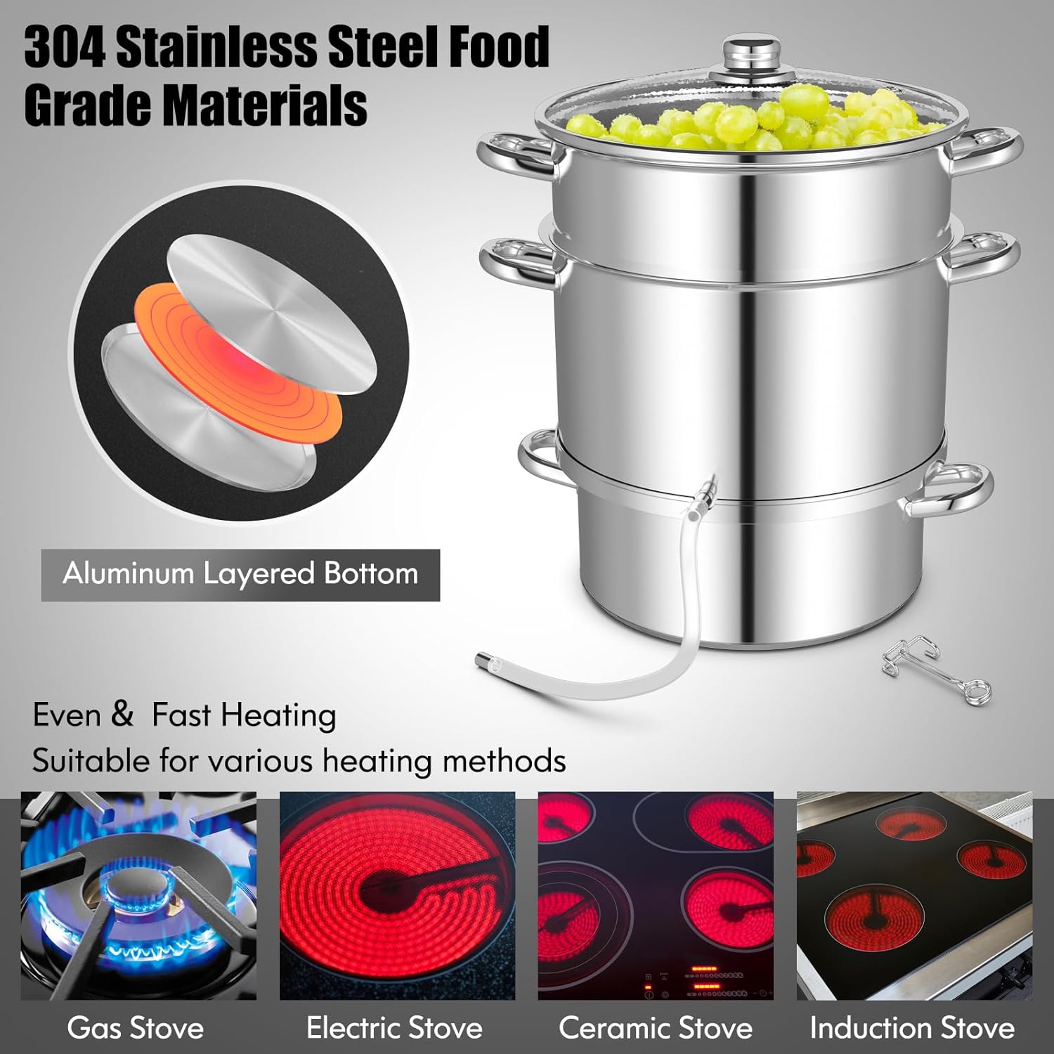 - π[Durable Stainless Steel Material]- Our fruit or vegetable juicer steamer is made of durable and long-lasting stainless steel which is clean and sanitary to ensure healthy and long-term use. Handles are all crafted of high quality stainless steel which is firmly welded on the steamer and brings you much convenience to hold and transport the juicer steamer.