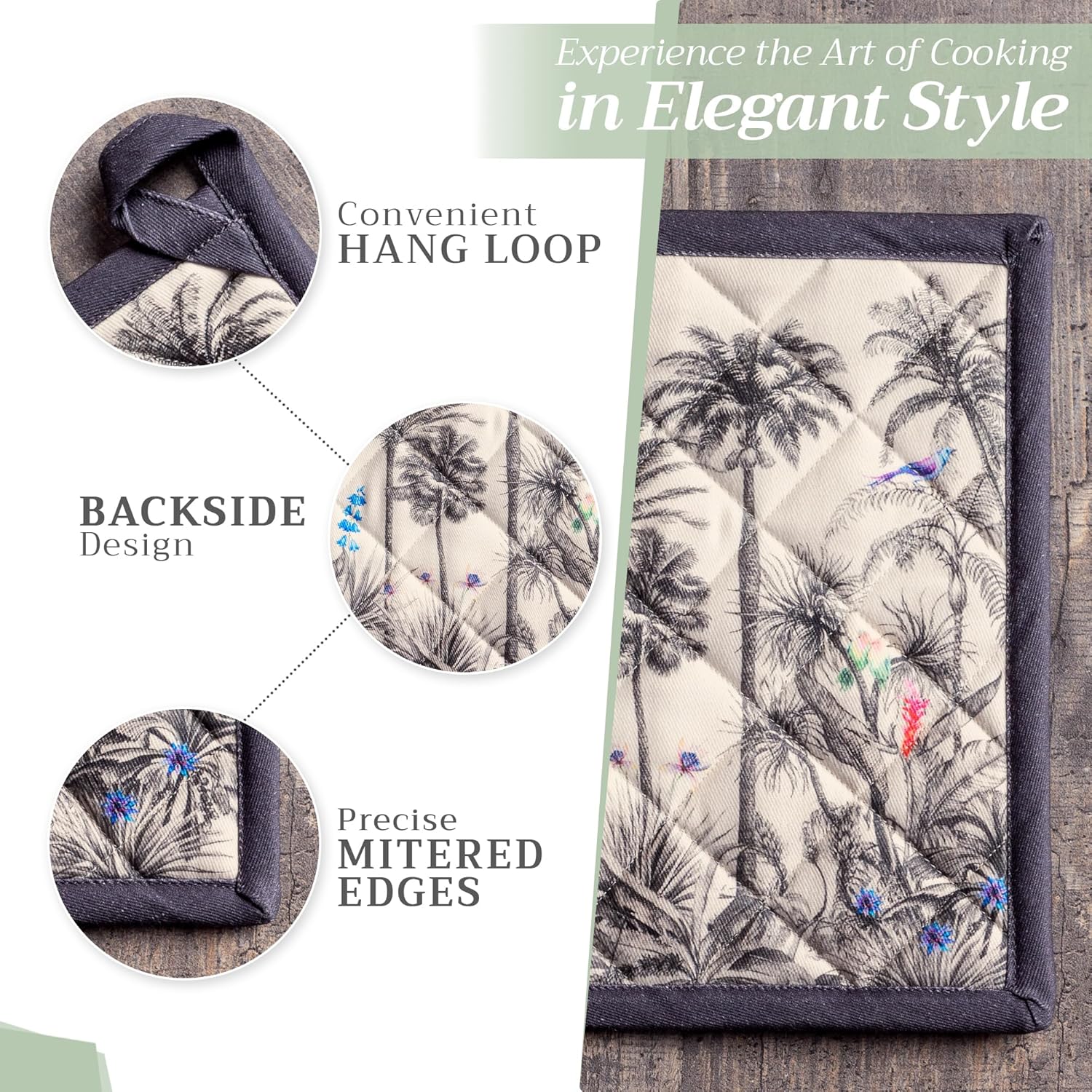 Maison d' Hermine 100% Cotton Oven Mitt & Pot Holder Set (7.5"x13" & 8"x8") Heat Resistant BBQ Cooking Gloves with Loop, Baking, Grilling, Kitchen, Handling Hot Pans (Amazonia)