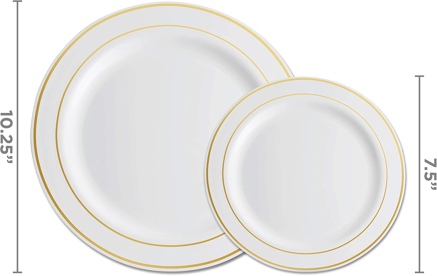Munfix 100 Piece Plastic Party Plates White Gold Rim, 50 Premium Heavy Duty 10.25 Inch Dinner Plates and 50 Disposable 7.5 Inch Dessert Appetizer Elegant Fancy Heavy Duty Wedding Plates