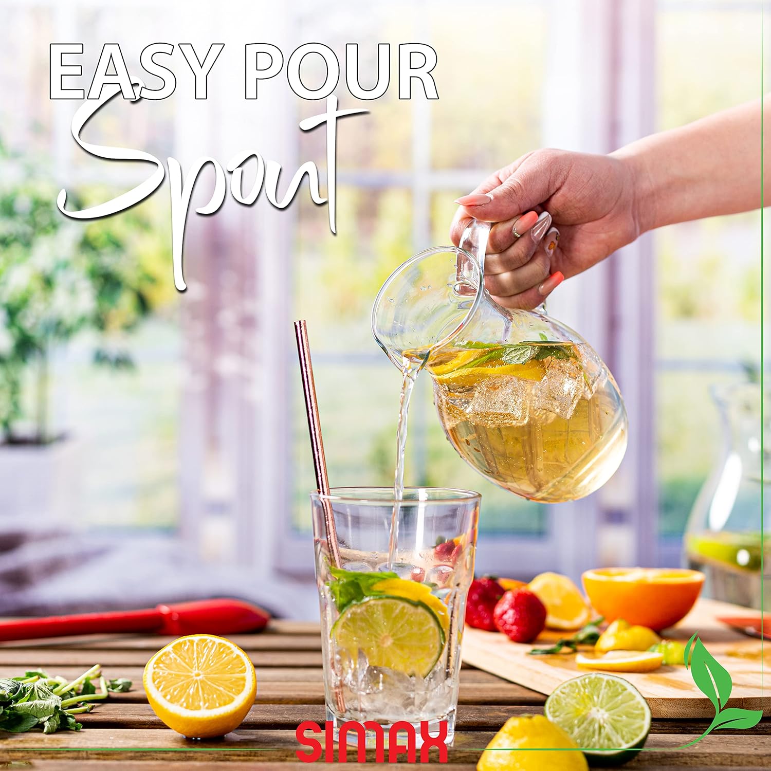 - A PITCHER WITH PRESENTATION: Thin walled for added elegance, yet with the strength of borosilicate, this small glass juice pitcher gives you the visual appeal of expensive glassware with the added durability necessary for daily use… the best of both worlds!