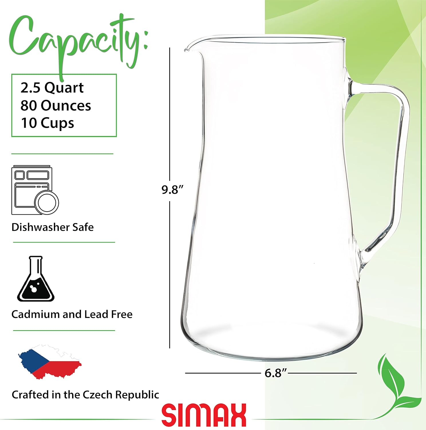 Simax Large Glass Pitcher With Spout, 2.5 Quart (80 Ounce) Borosilicate Glass Iced Tea Pitchers with Handle, Angled Cylinder Design, Glass Water Pitcher,