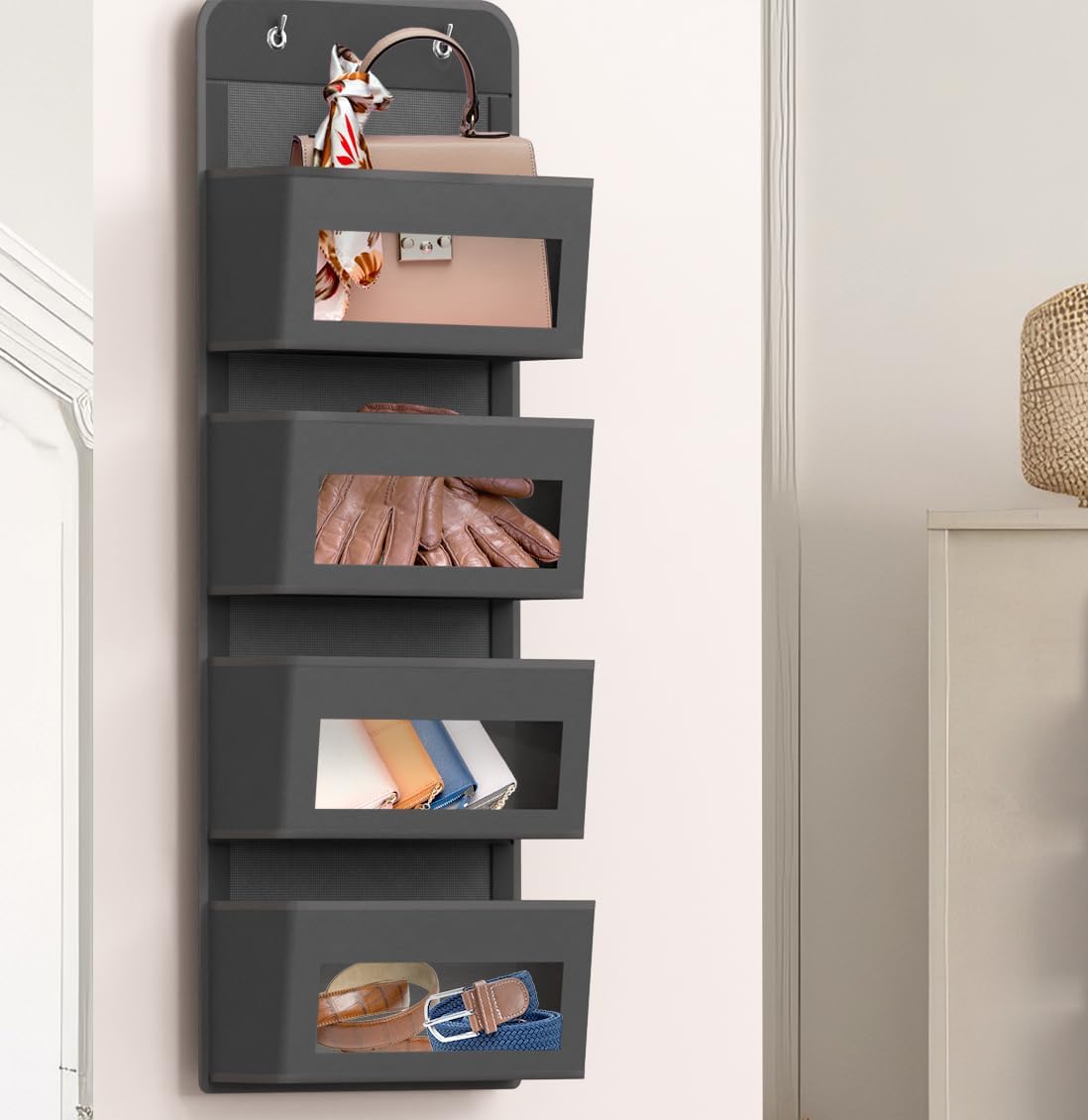 Simple Houseware 4 Clear Window Pocket Over Closet Door Storage Hanging Organizer for Bedroom, Bathroom, Pantry, Dark Grey