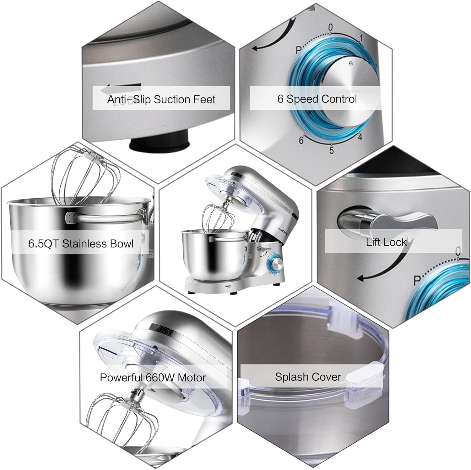- 【MULTIPLE ATTACHMENT SET】 Aucma stand mixer comes with three mixing accessories: whisk, dough hook, mixing beater.The splash guard with access hatch helps add ingredients without making a mess.