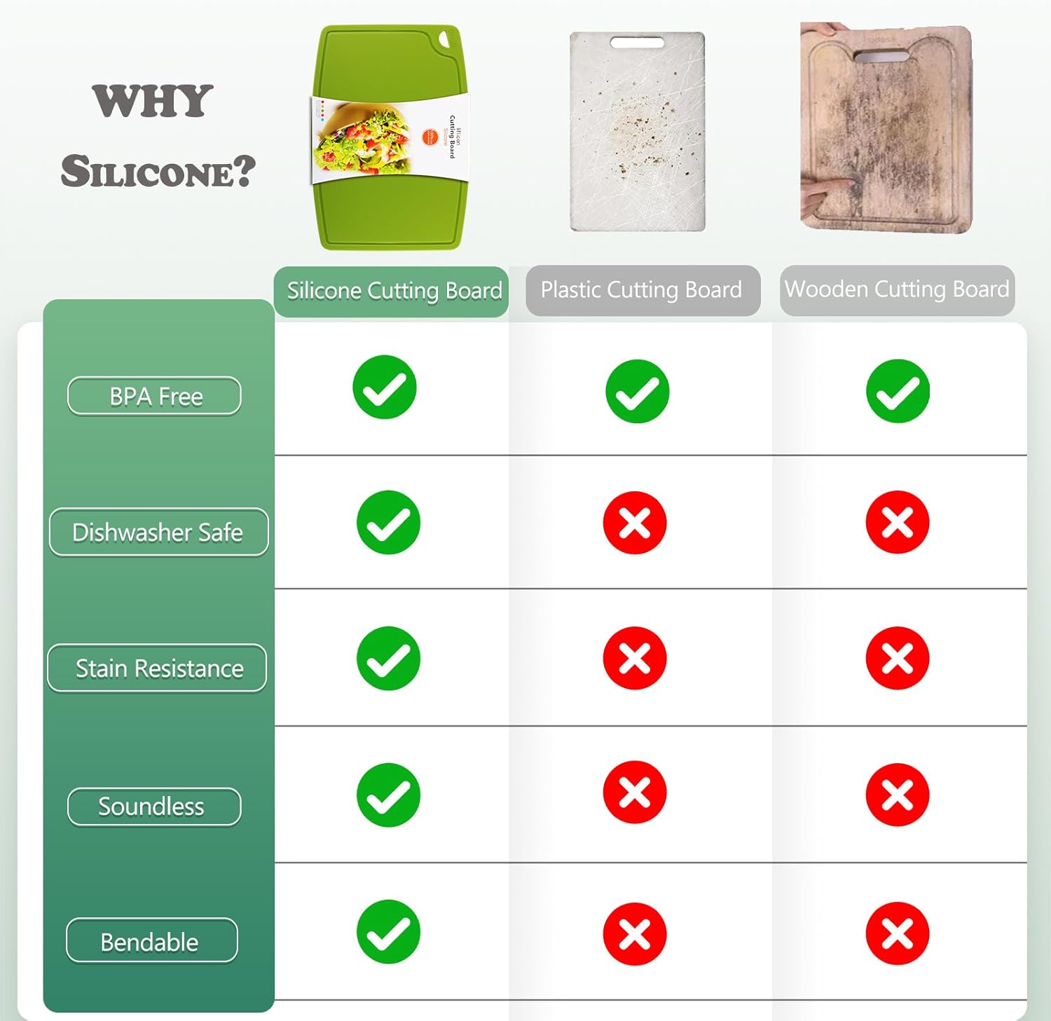 - 【THICK AND FLEXIBLE DESIGN】: Non-Stick & Non-Toxin Flexible Silicone Cutting boards, flexibility and durability allows for easy transfer from chopping to bowl and makes sure that you won't cut through our cutting boards and that they will not wear out as quickly or easily as the others.