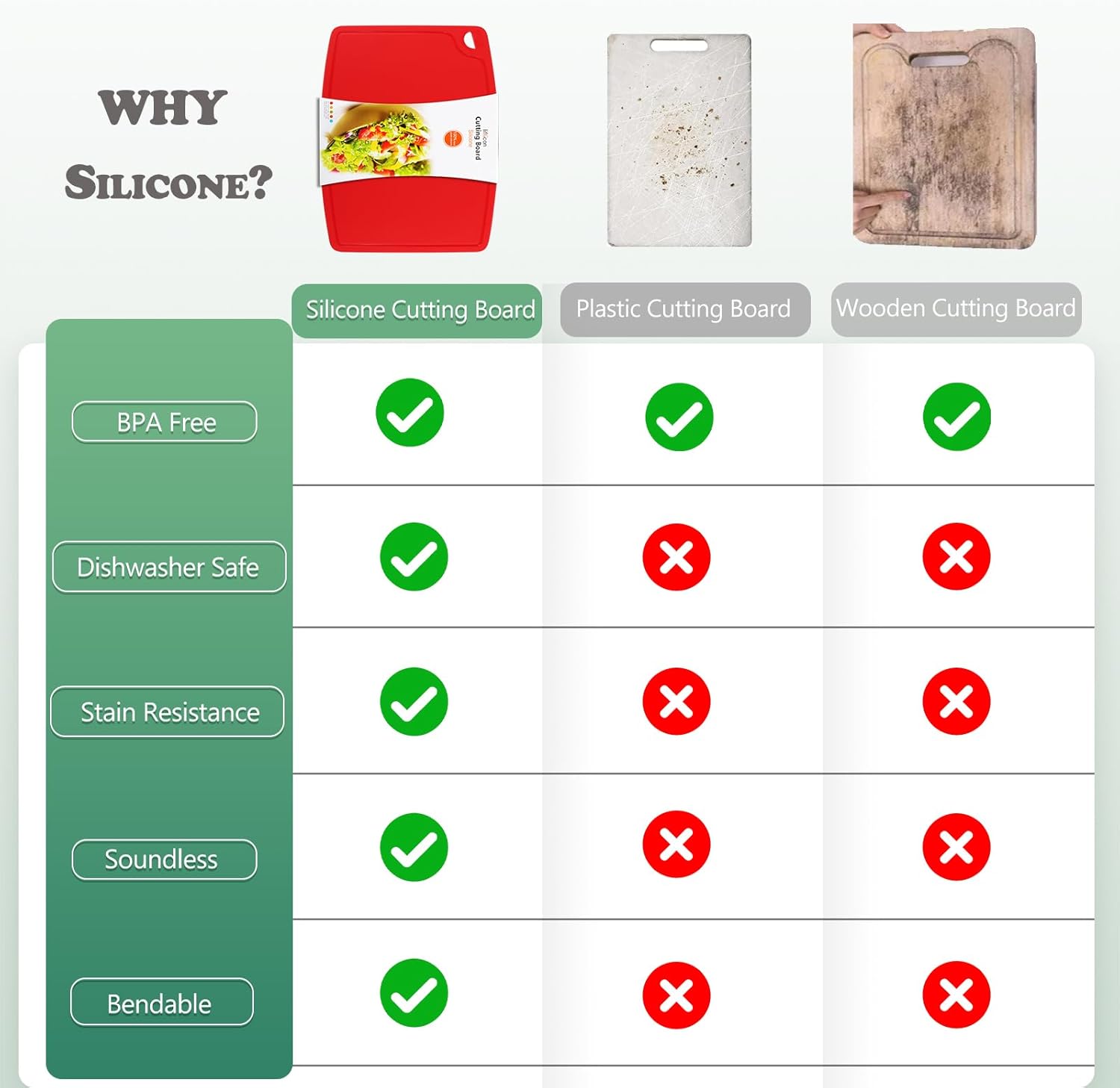 - 【HEALTHY &SAFE】: Certificated food safe Food-Grade Silicone. Heat resistant -40°F to 482°F(-40°C to 250°C) ,our silicone cutting boards and mats made from premium quality silicone is non-slip, heat proof and dishwasher safe.