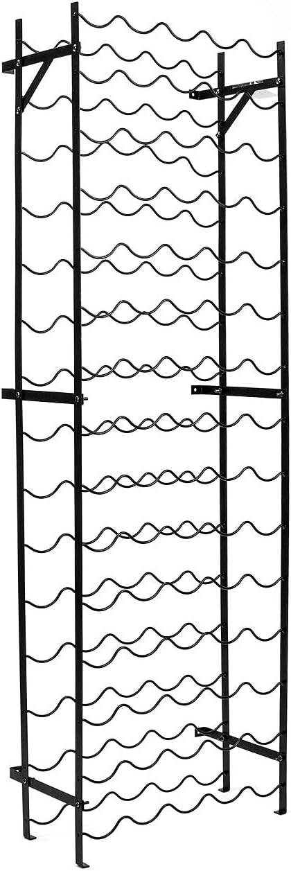 - STURDY DESIGN — Made of durable metal construction with smooth black finish — Features 15 rows of scallop/wave shaped shelves — Solid structure prevents wobbling, tilting, or falling — Holds most standard wine bottles — Wine Bottles NOT INCLUDED — Measures approximately 19” L x 9.50” W x 59.50” H (Approx 3.75” between each tier)