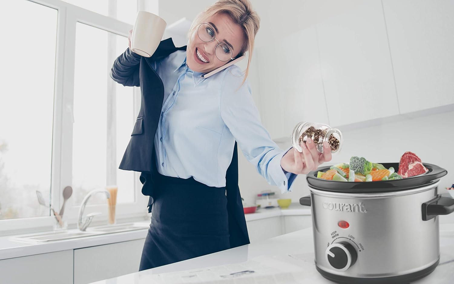 - Courant 1.6 quart capacity Crock slow cooker: Whip up savory dishes anytime, using basic ingredients available on hand! Our great series of slow cookers is designed to turn “simple input into delicious output”! No more hassling with time limitations! Recipes included!!