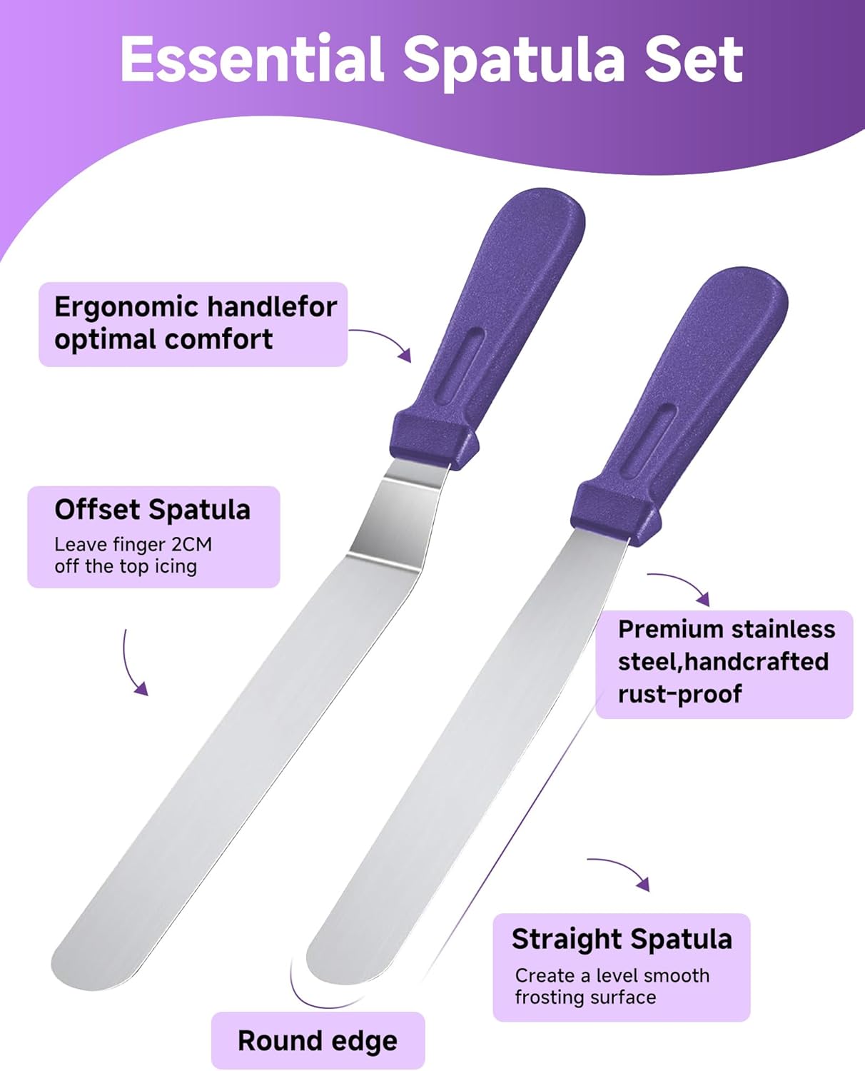 - Straight and Angled Frosting Spatulas: These high-quality stainless steel frosting spatulas make it easy to even out frosting and work on layered cakes. With a 10.6-inch angled spatula and a 10.6-inch straight spatula, you can create even crumb layers and perfect surfaces.