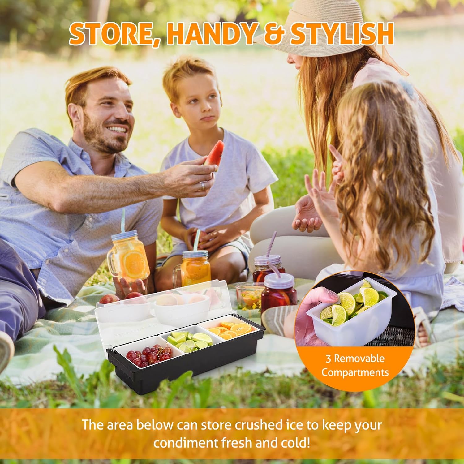 WICHEMI Fruit, Veggie & Condiment Caddy with Lid Dispenser Tray Plastic Garnish Station for Bartending & Serving Taco, Ice Cream, Salad Bar - Topping Organizer for Restaurant Supplies (3 Compartment)