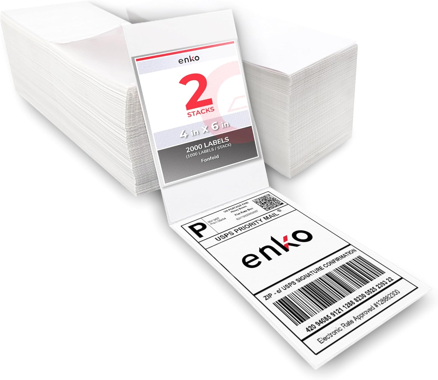 enKo 2 Stacks/2000 Labels 4"x6" Fanfold Direct Thermal Labels Compatible for Rollo Zebra Printer - Shipping Mailing Postage Labels, Perforated, Permanent Adhesive (2 Labels/Fold | 1000 Labels/Stack)