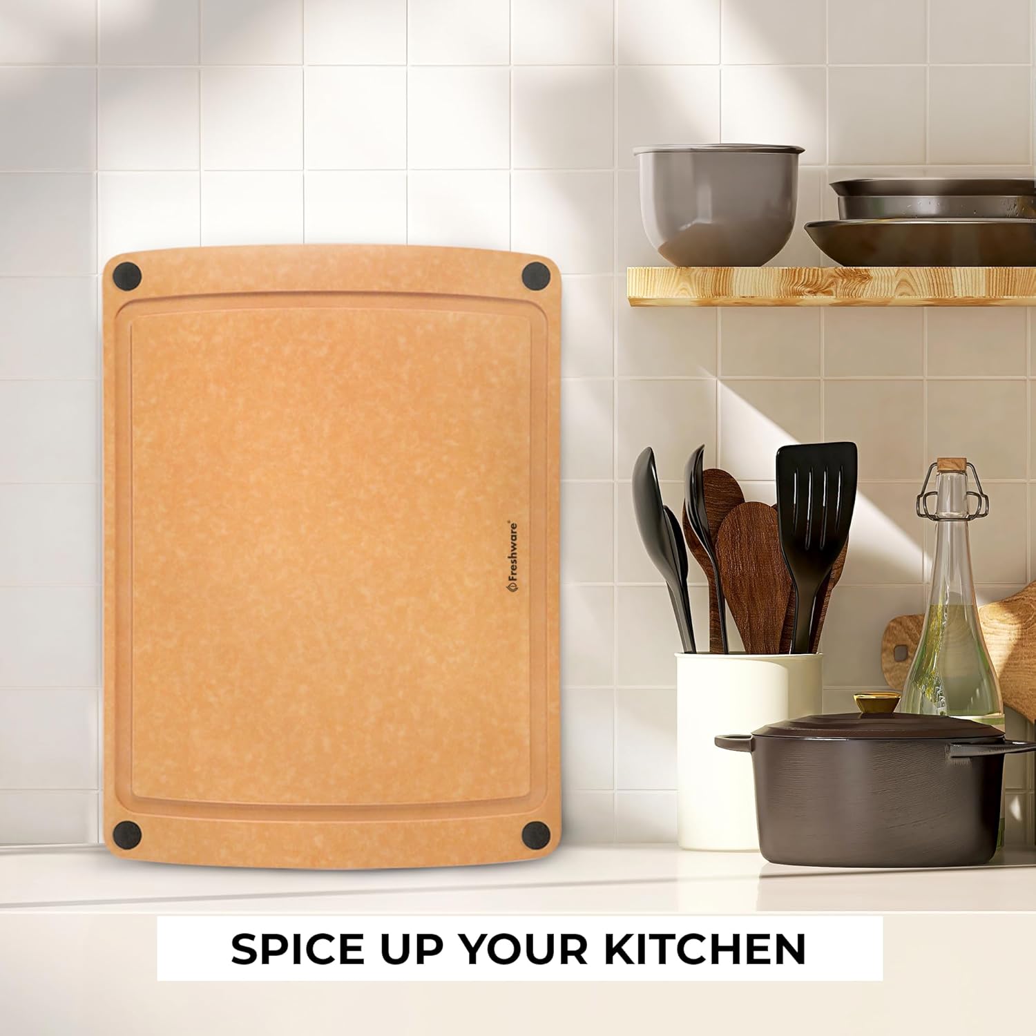 - ✅ EASY TO CLEAN & DISHWASHER SAFE - X Large 18" x 13" wood fiber cutting board, wooden natural color, juice groove, non-slip silicone feet, dual-sided cutting surface. If you are looking for a crafted wood cutting board that is extremely safe to use, then we got you covered. BPA-free, dishwasher safe, Freshware wood cutting boards provide a clean food prep surface for every meal.