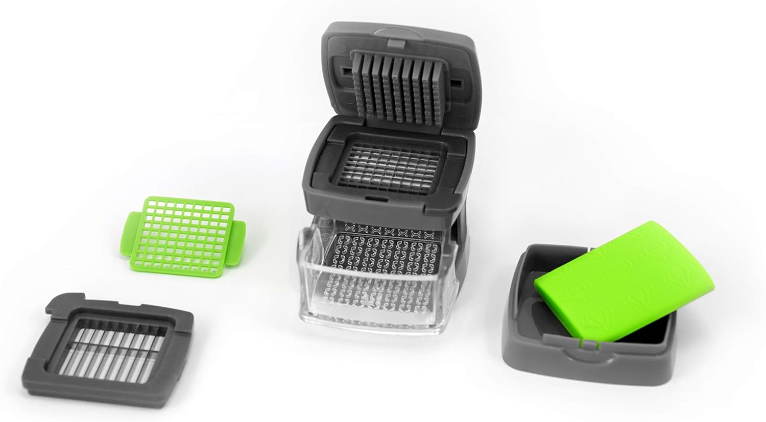 - Peel, slice, dice and grate garlic with this innovative garlic tool with silicone peeler and 2 interchangeable blades; Dicing blade creates cube shaped garlic and slicing blade creates longer and thinner garlic; Clear container contains raised teeth for creating the perfect garlic paste