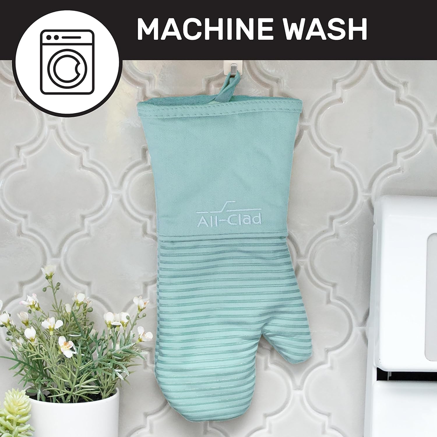 - MACHINE WASHABLE. All Clad's Silicone Oven Mitt Set is machine washable for hassle-free cleaning.