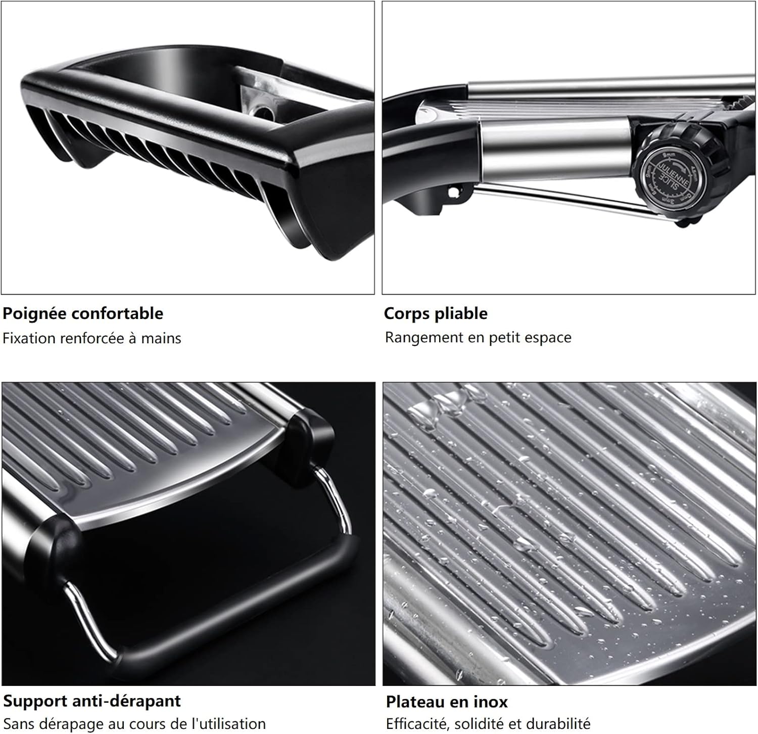 - Save Your Space:The blades are built-in and does not require extra space for storage. The folding handle and non-slip feet of the vegetable slicer are foldable, making it comfortable to use and easy to fold and store. Unit folds flat for easy storage in a drawer.