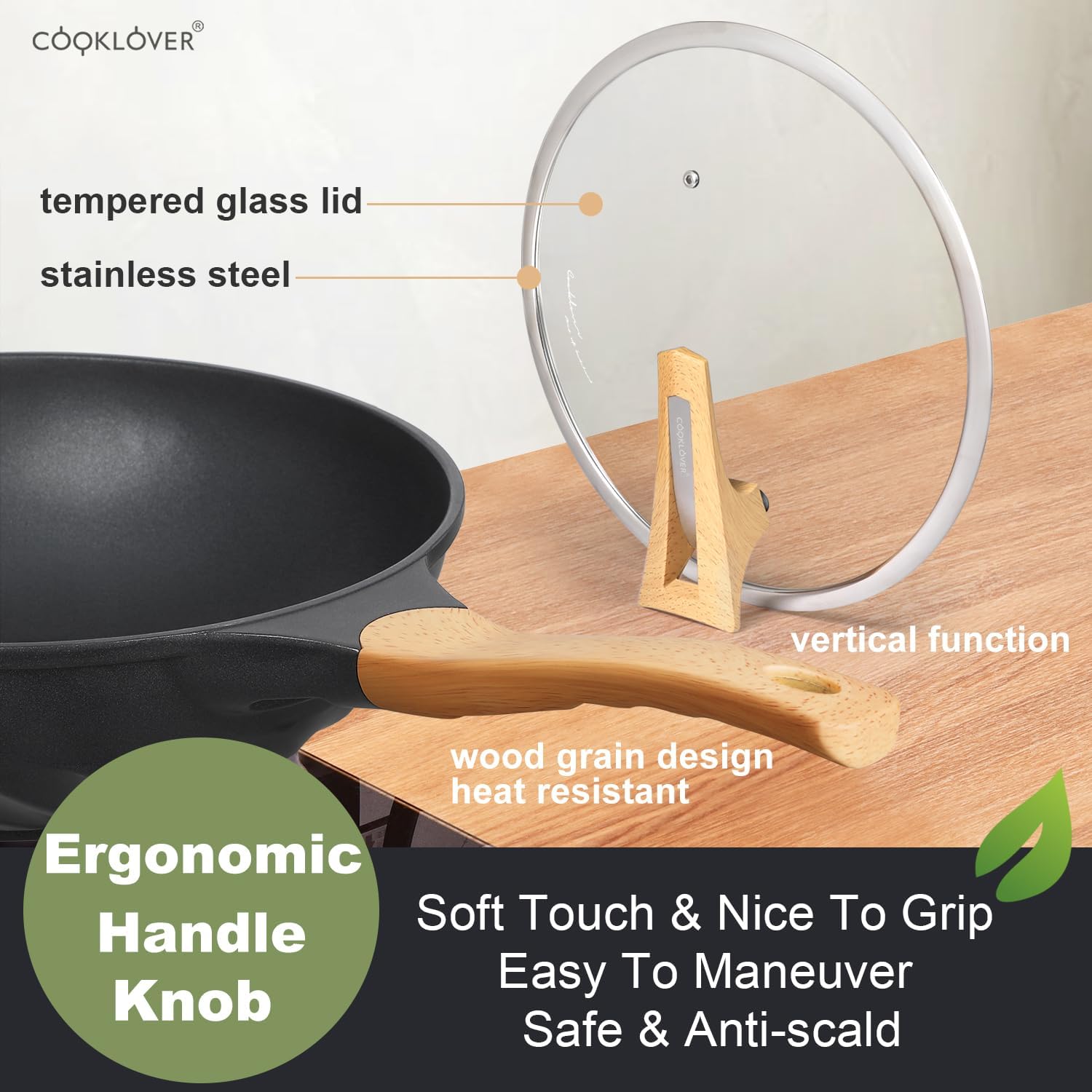 - ✅Ergonomic Bakelite knob and handle: COOKLOVER's wok builds with Eye-catching heat resistant soft touch silicone robust Bakelite knob and handle with beautiful wood grain design (not real wood). Stay cool and comfortable. Easy to maneuver, Safe & Anti-scald.