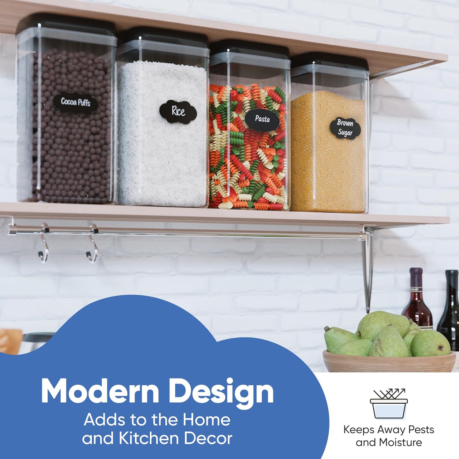 - SUPERIOR BUNDLE - Comes with 4 Elegant Food Storage Containers, a Chalkboard Marker & 10 Reusable Chalkboard Labels allowing you best pantry organising. This set comes in a beautiful box which makes it an IDEAL GIFT for any family.
