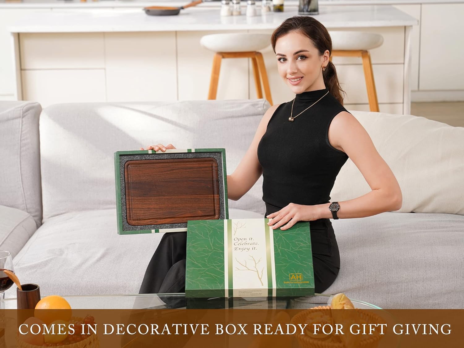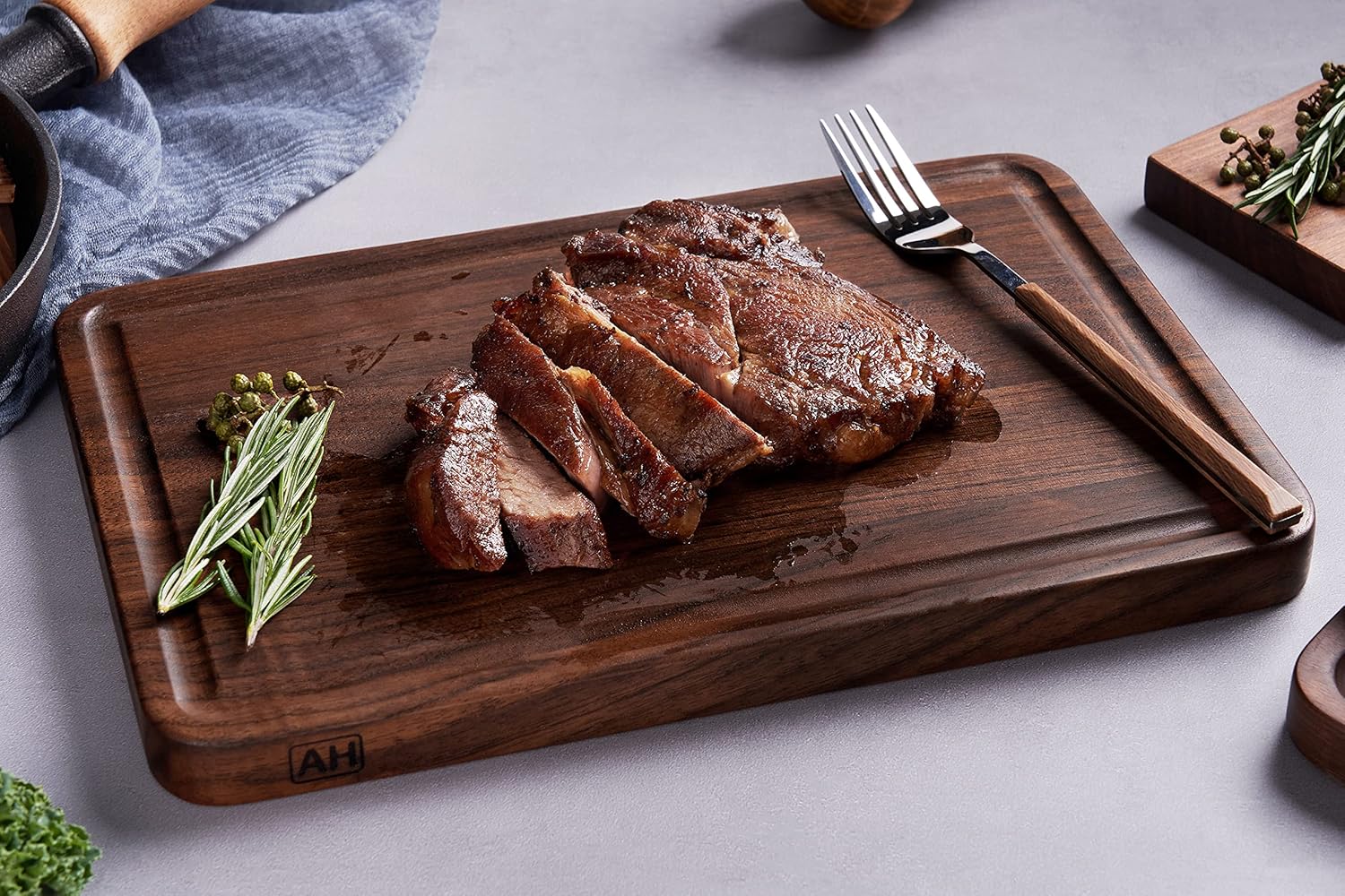 AZRHOM Small Walnut Wood Cutting Board for Kitchen 12x8 in (Gift Box) with Juice Groove Handles Non-slip Mats Thick Reversible Butcher Block Chopping Board
