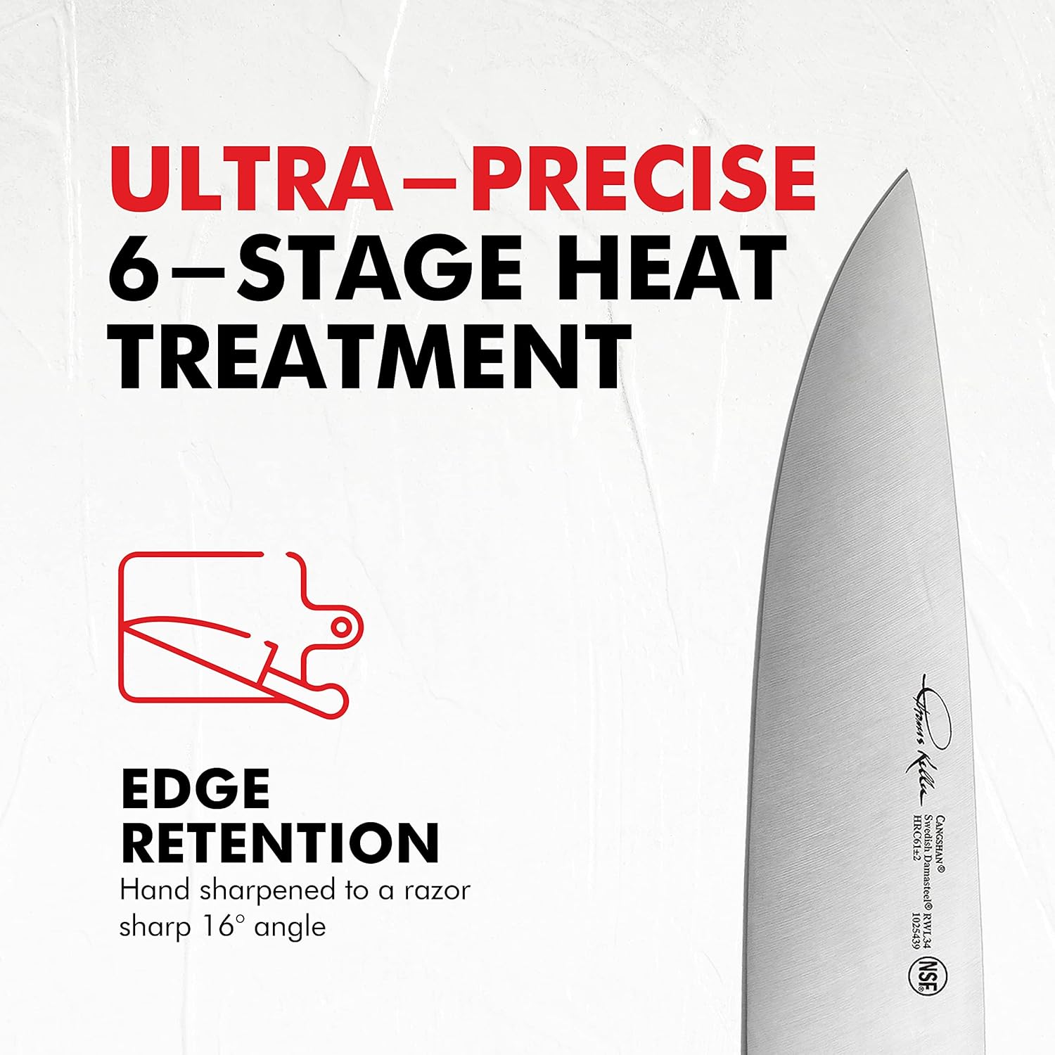 - Forged from Swedish Damasteel RWL34 powdered steel, an extraordinarily fine-grained, high-alloy steel known for its excellent edge strength, hardness and corrosion-resistance. Full-tang blade construction. Bolster-free design supports firm pinch grip and allows easy honing/sharpening.
