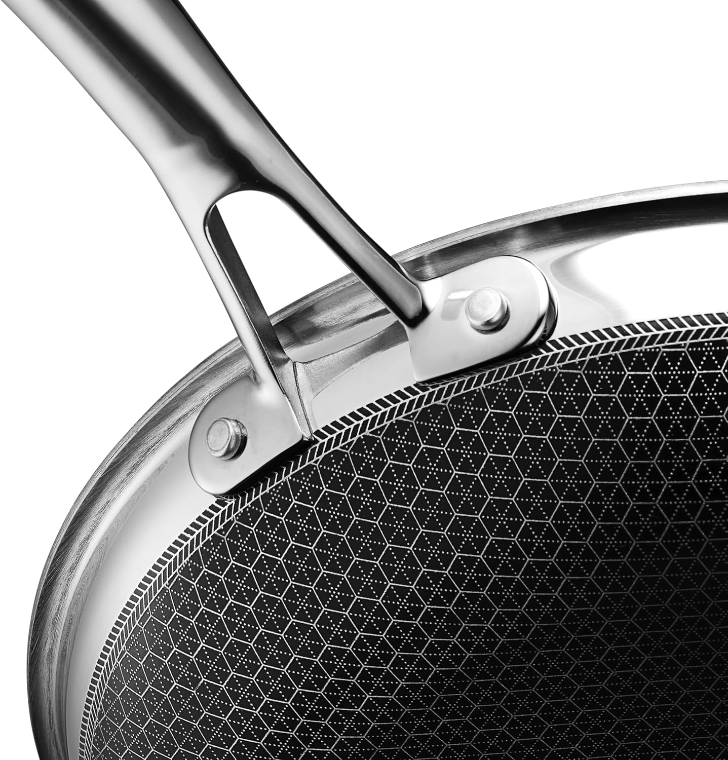 - HexClad’s patented Hybrid technology features a laser-etched hexagonal nonstick surface that combines both stainless-steel and our TerraBond ceramic coating for the ultimate sear and easy cleaning.