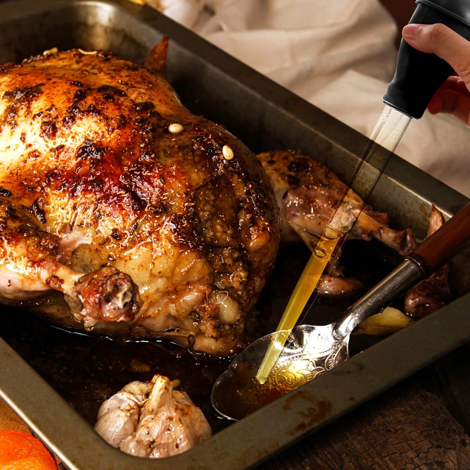 - Using introduction: it is easy for you to squeeze the top and use the suction to absorb the juices as needed to pour over the turkey, ham, or other dishes