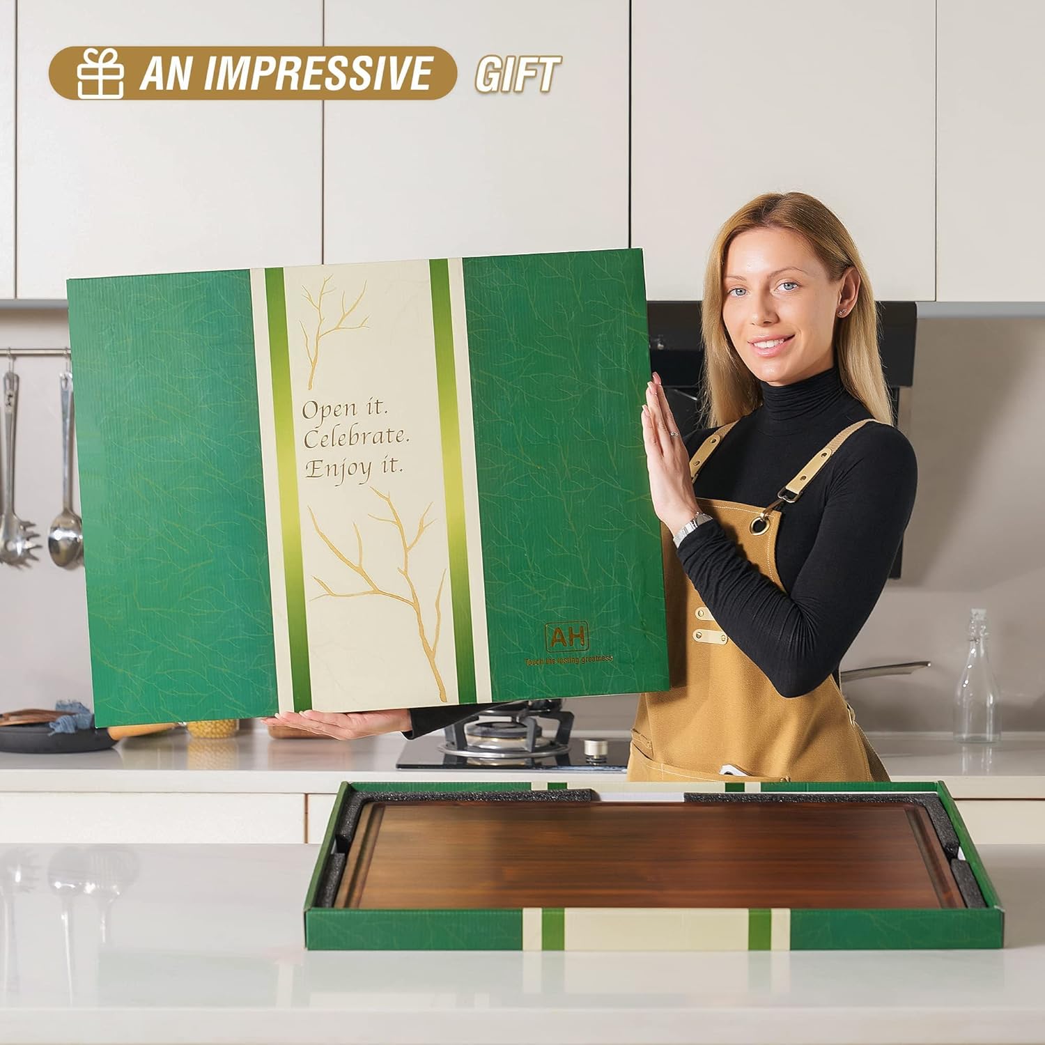 AZRHOM XXL Large Walnut Wood Cutting Board for Kitchen 24x18 (Gift Box) with Juice Groove Handles Non-slip Mats Thick Reversible Butcher Block Chopping Board