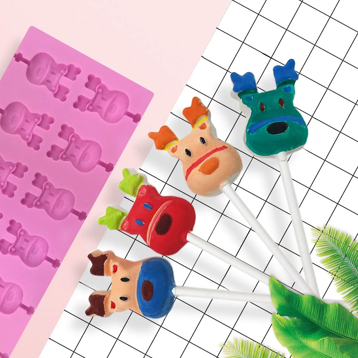 12 Capacity Silicone Deer Lollipop Mold Set, Sucker Molds and Chocolate Hard Candy Mold with 50pcs Lollipop Sucker Sticks, Candy Treat Bags, Gold Ties. (Deer)